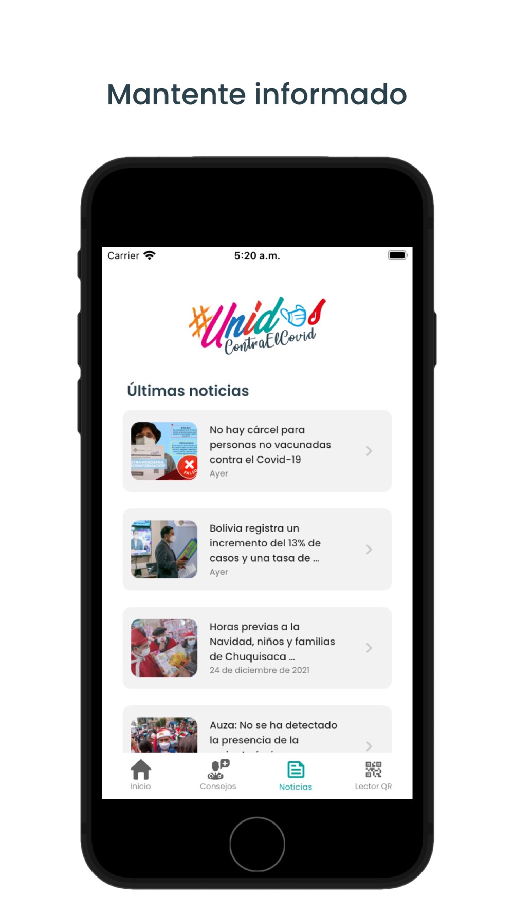 Bienvenido a la aplicación #UnidosContraElCovid, en la que encontrarás información oficial referente a los síntomas, la prevención y la vacunación contra el virus COVID-19 en Bolivia.