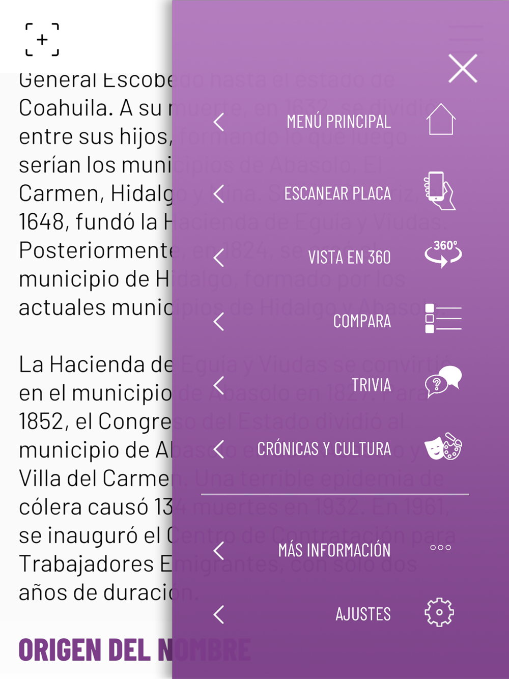 Esta App esta equipada con disparadores de QR, los cuales están instalados en los alrededores del Obelisco a la fundación de Monterrey. Al caminar por la glorieta el usuario encontrará 51 placas distribuidas en la periferia de la misma, estas placas metálicas tienen el nombre y escudo de cada municipio de Nuevo León, el usuario puede dirigir su móvil sobre el escudo del municipio y el app disparara la ficha que contiene la información del municipio.