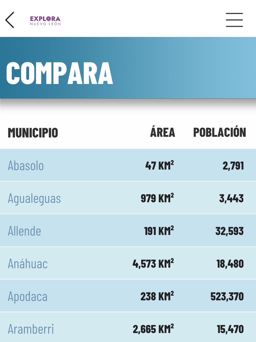 Esta App brinda de manera entretenida, información relevante de los 51 municipios del estado de Nuevo León. Esta app ofrece información geográfica, histórica, turística, cultural, personajes famosos de la región e información de cultura popular y otro contenido de entretenimiento como fotos, juegos y videos. El App también proporciona enlaces a las páginas web de los municipios. El funcionamiento permitirá organizar los municipios alfabéticamente, por distancia, área o población.