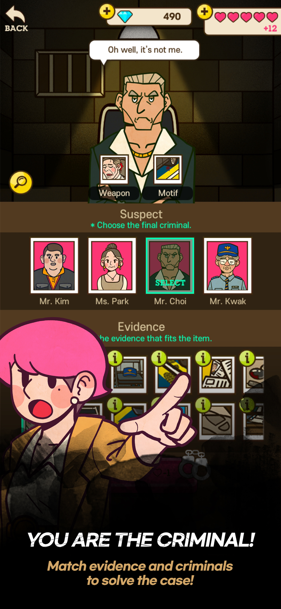 Find the murderer's murder weapon and the evidence that symbolizes the resentment among the evidence acquired from the picture game and arrest the criminal by matching them with the suspects!