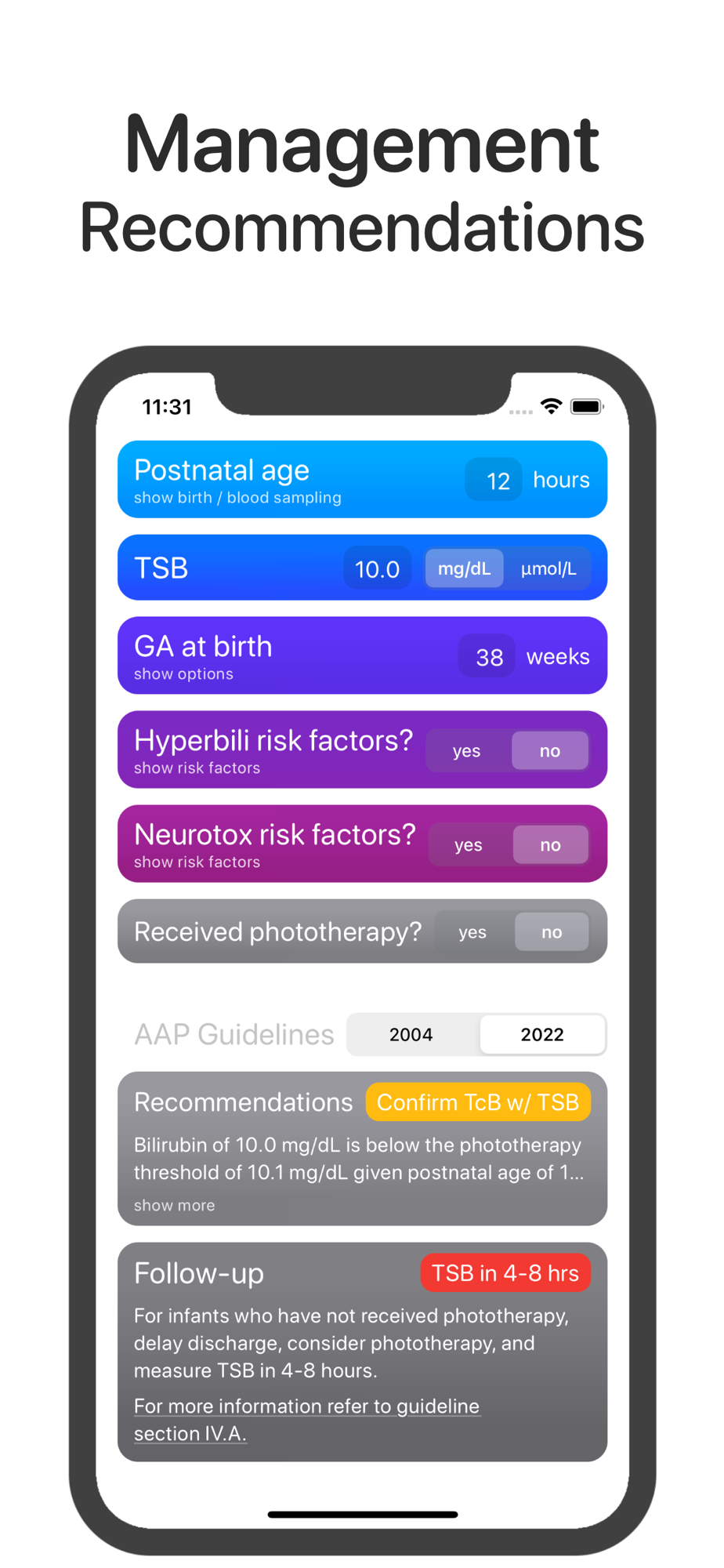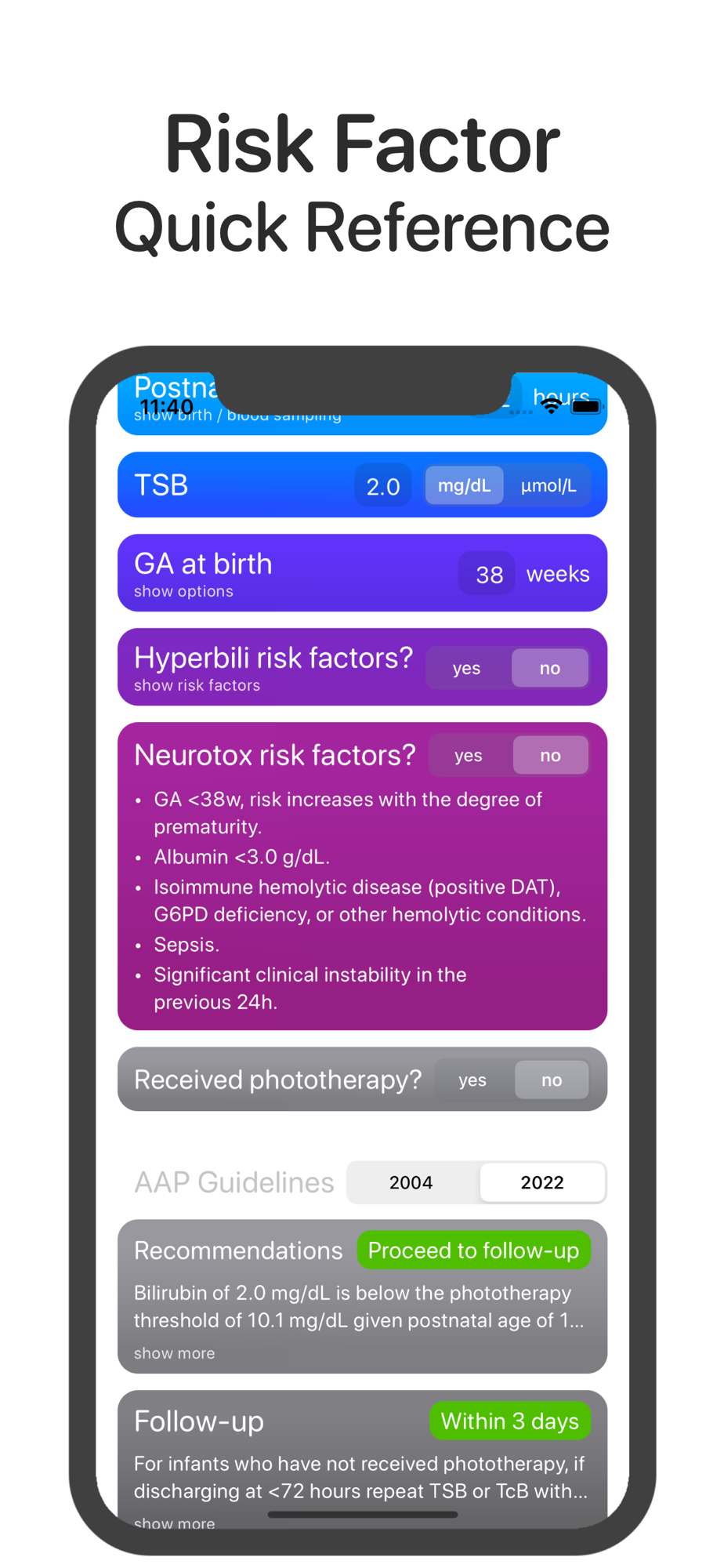 Offline Bilitool in one screen. Based on the 2022 American Academy of Pediatrics (AAP) "Clinical Practice Guideline Revision: Management of Hyperbilirubinemia in the Newborn Infant 35 or More Weeks of Gestation" guidelines. Previous 2004 guidelines also available via an in-app toggle. Designed and developed by family physician Dr. Émilie Coudière, MD.