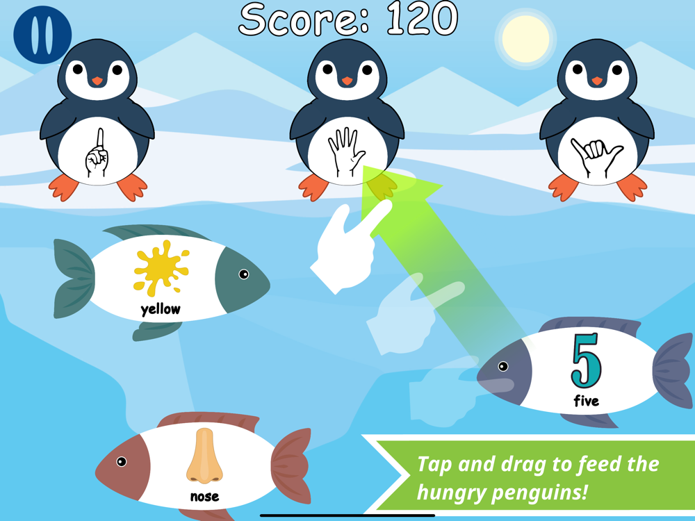 Hungry Penguins: Penguins are standing along a shore and are waiting to be fed! But these penguins are picky eaters! They'll only eat fish whose picture/text matches the ASL handshape on their belly.