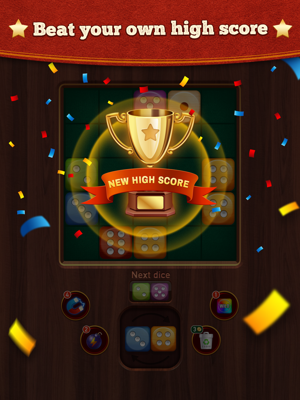 * Match three or more adjacent wooden dice with the same pips to merge them horizontally, vertically, or both.
