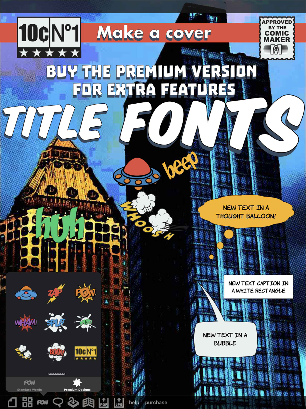 The premium version includes over 150 comic stickers. Photos can be adjusted with several effects including comic outlines, halftones and colour adjustments. The shape of the word balloon can be changed. Several custom fonts are included.