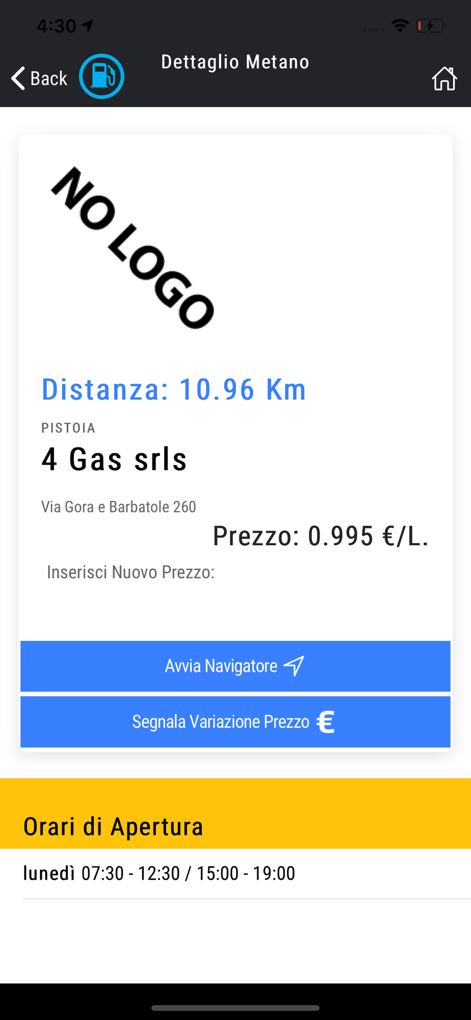 Grazie a Cerca Gas Auto, avrai la possibilità di trovare il distributore di gpl o metano per la tua auto, nel più breve tempo possibile. Con la funzione "DISTRIBUTORI VICINI", otterrai l'elenco dei distributori più vicini alla tua posizione, con la possibilità di vedere solo quelli aperti nel momento della ricerca, oppure tutti i distributori; inoltre con l'opzione "SOLO AUTOSTRADA", verranno segnalati solo i distributori presenti sulle autostrade. Selezionando il singolo distributore, avrai tutti i dati del distributore a portata di mano, e con semplice gesto, potrai avviare la navigazione verso il distributore stesso. Le informazioni sul prezzo attuale del metano in quel distributore, la possibilità di vedere gli orari di apertura e di segnalare una variazione del prezzo, completano le funzioni presenti all'interno della scheda del distributore.