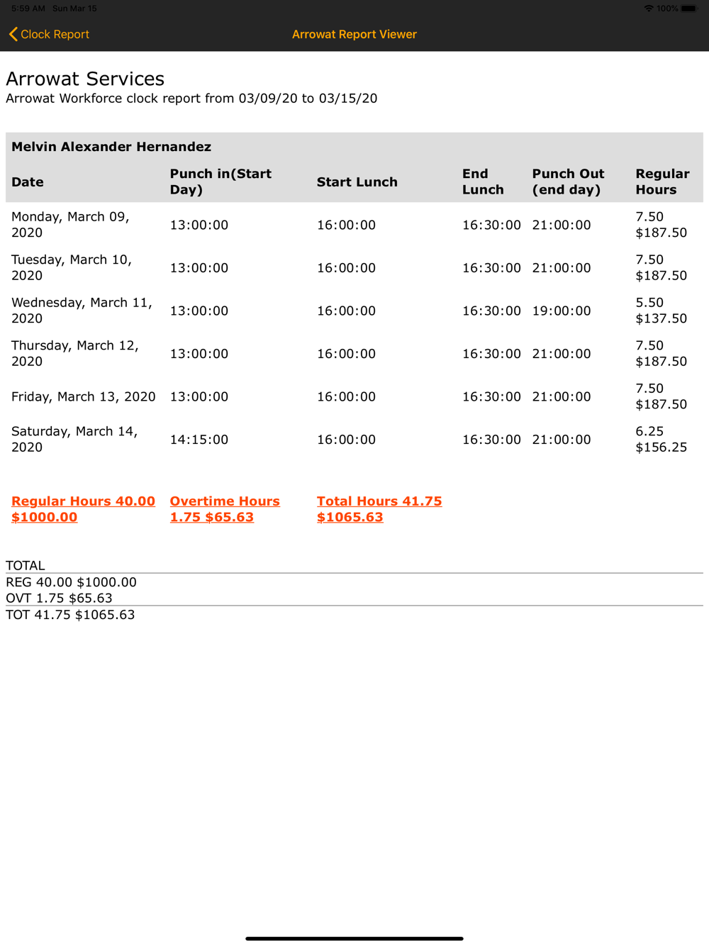 Arrowat Workforce uses SQLITE local Database Engine to store data. Arrowat Workforce is a time card app and offer complete Working hours by day and generate report by date range selected, Allowing you to calculate how much the employee has earned by the end of the day,week or date range.