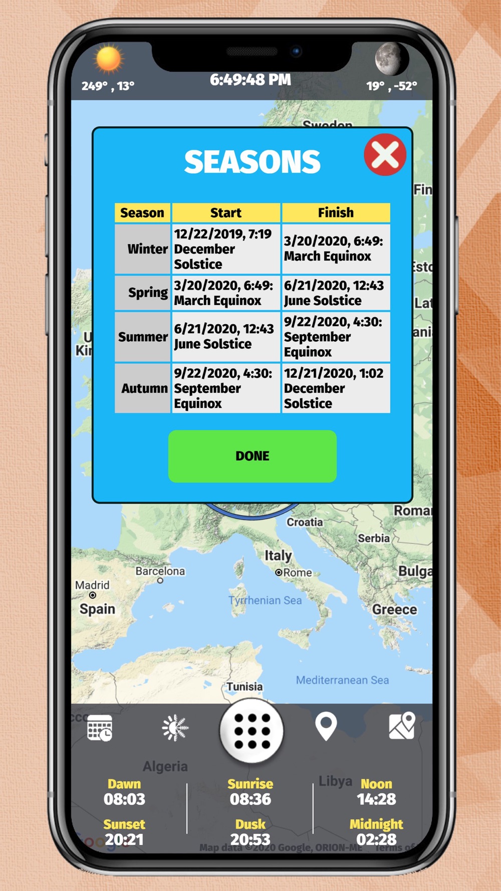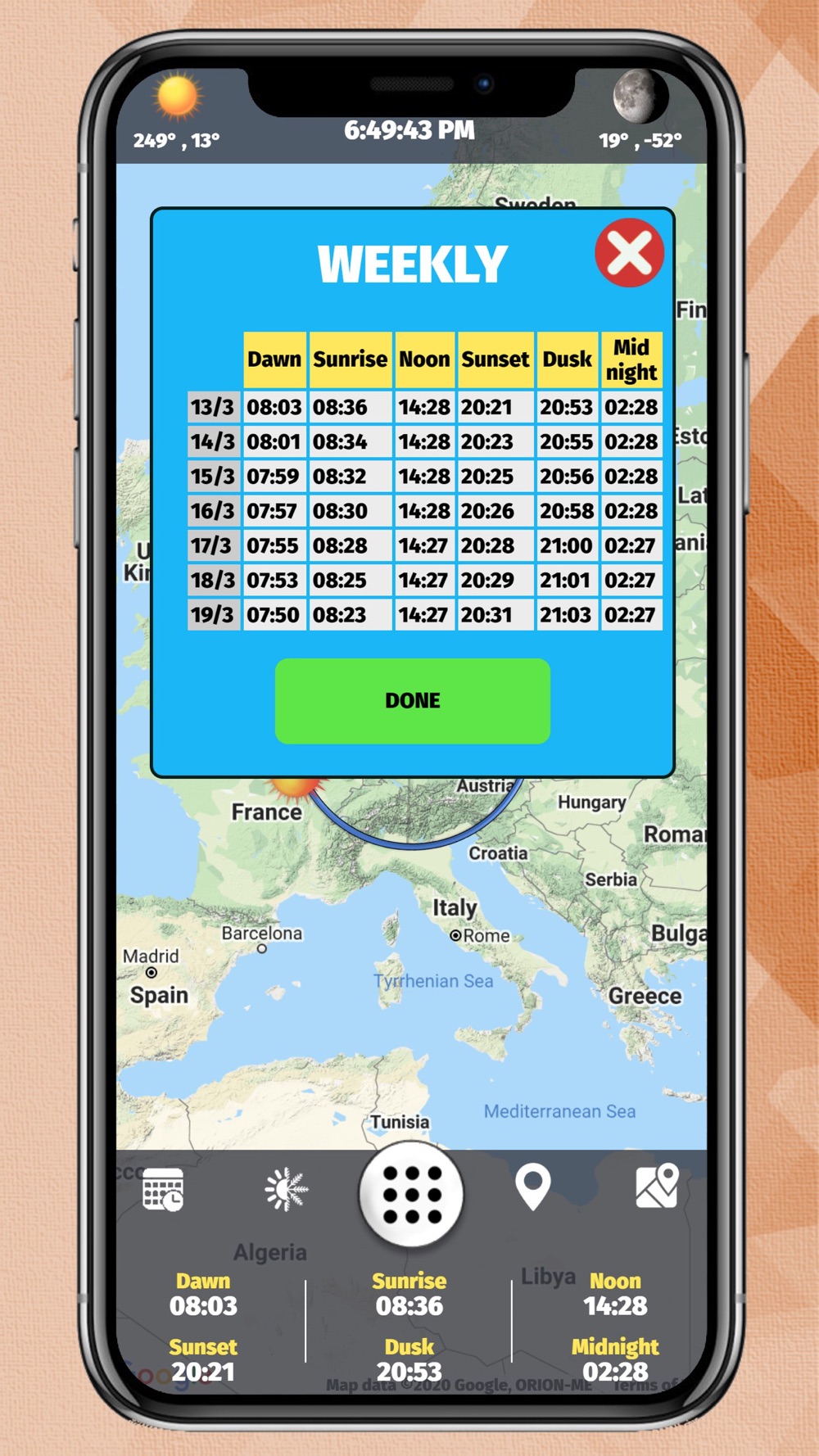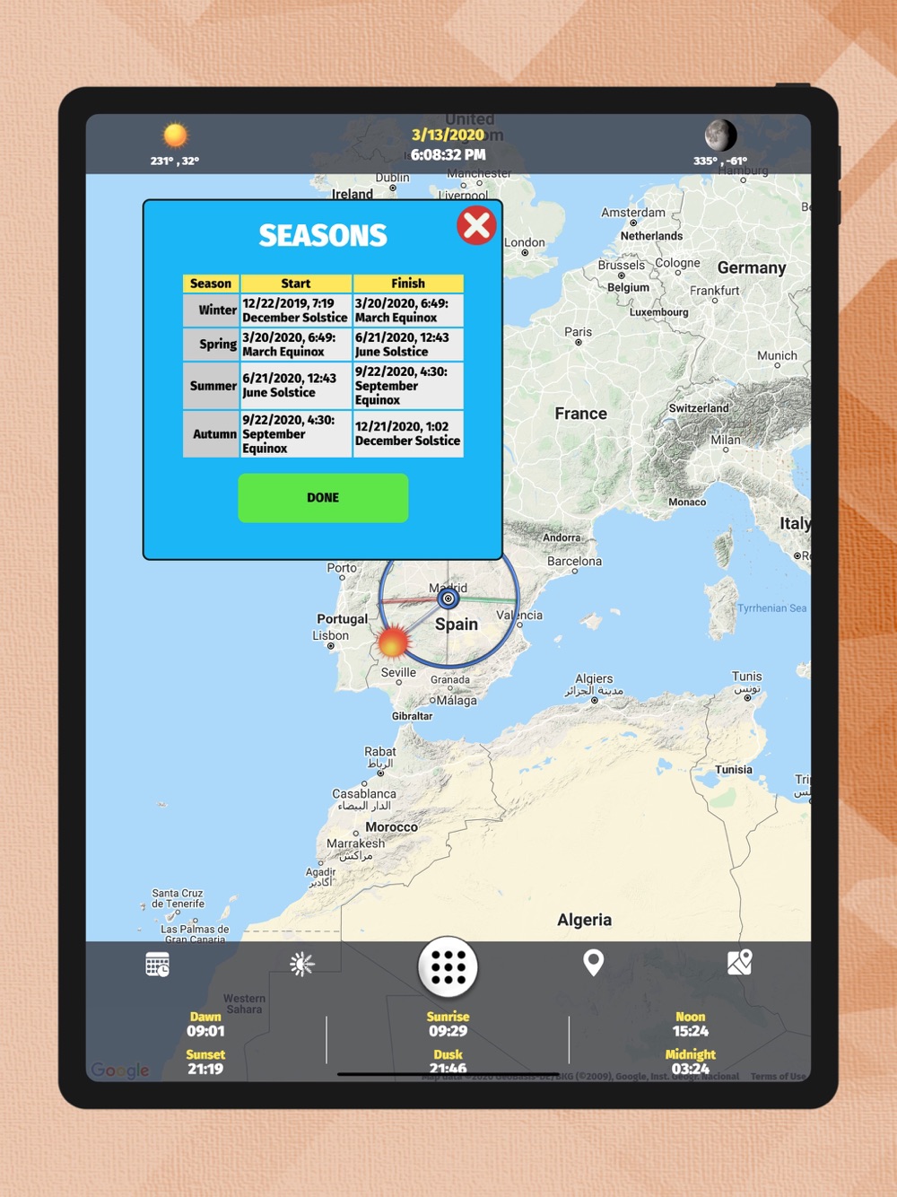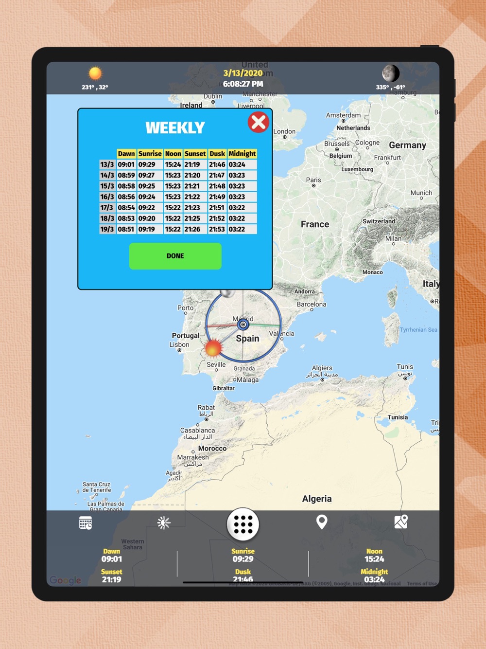 With the Sun Tracking application, you can follow the location of the moon and the sun with high sensitivity instantly. You can see the times of Dawn, Sunrise, Lunch, Sunset, Evening and Midnight with certain accuracy.
