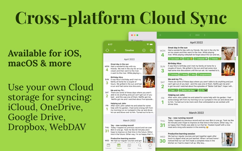 • Write your journal on any device (PC, laptop, tablet, phone, …) using Cloud Sync