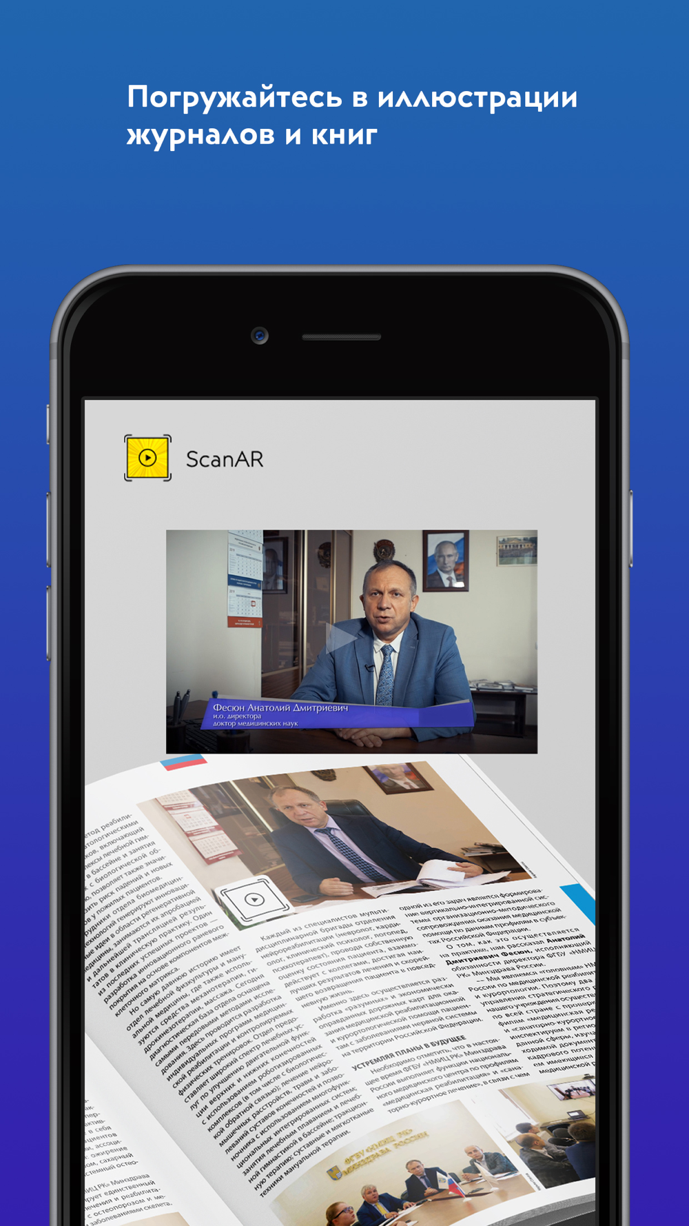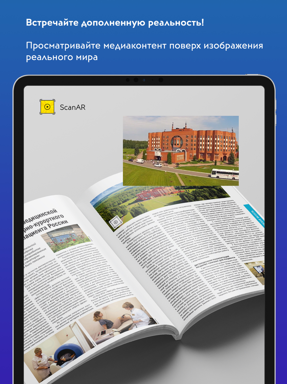 С приложением ScanAR [сканер дополненной реальности] все статичные изображения в журналах, книгах, каталогах, альбомах, в холлах зданий, в музеях, на выставочных стендах, на приглашениях, открытках, визитках приходят в движение: люди на фотографиях начинают говорить, фасады зданий распахивают свои двери и показывают работу организаций изнутри, оборудование демонстрирует свои возможности, логотипы компаний оживают, выставочные и музейные экспонаты становятся интерактивными, настенные инструкции и указатели превращаются в настоящие видеогиды, картинки слайдов трансформируются в полноценные презентации, а публикации отчётов о конференциях обеспечивают ощущение присутствия в зале с возможностью просмотра выступлений спикеров.
