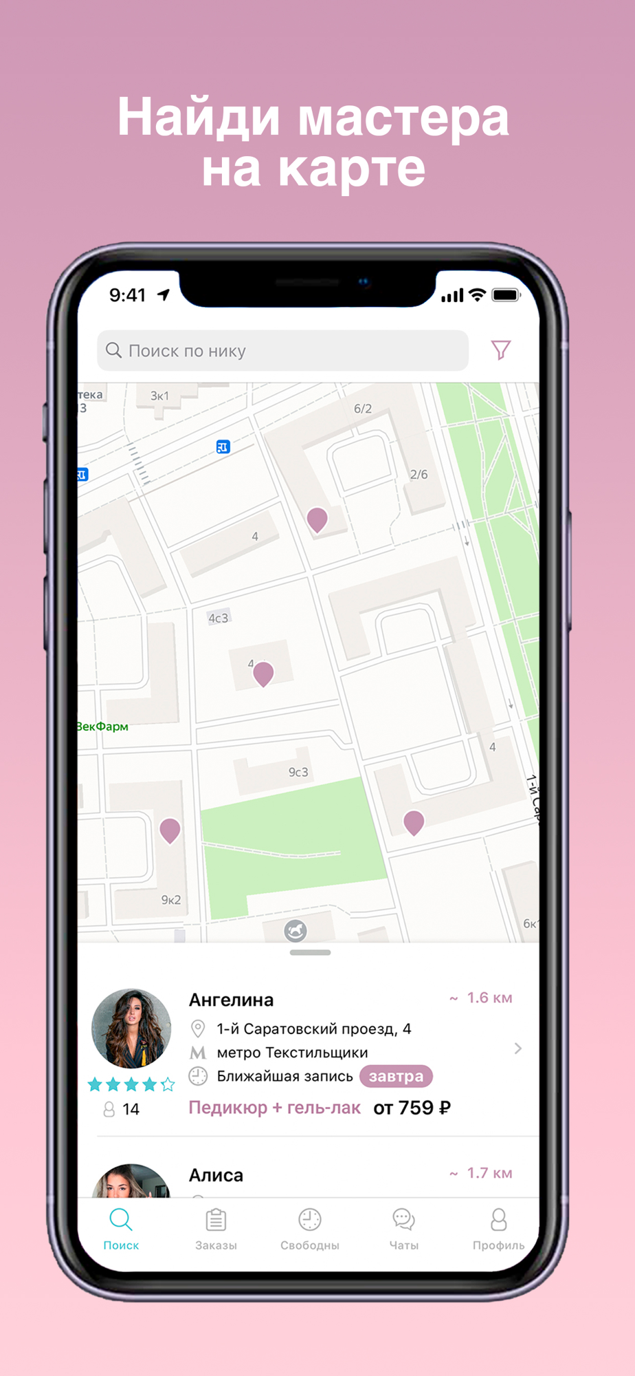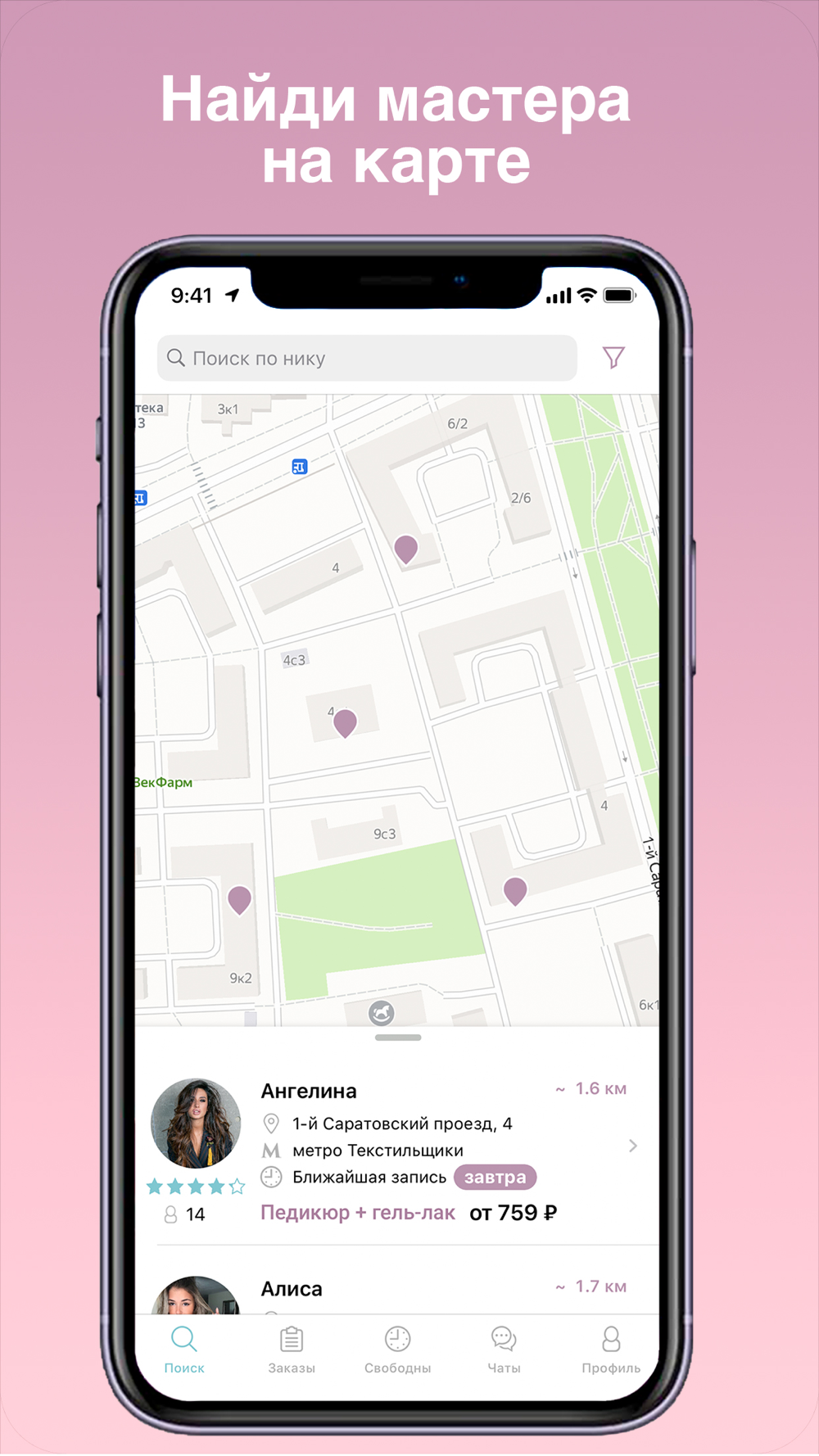 Вы можете найти мастера вручную на карте, а можете поставить фильтр по ближайшему метро или даже району!