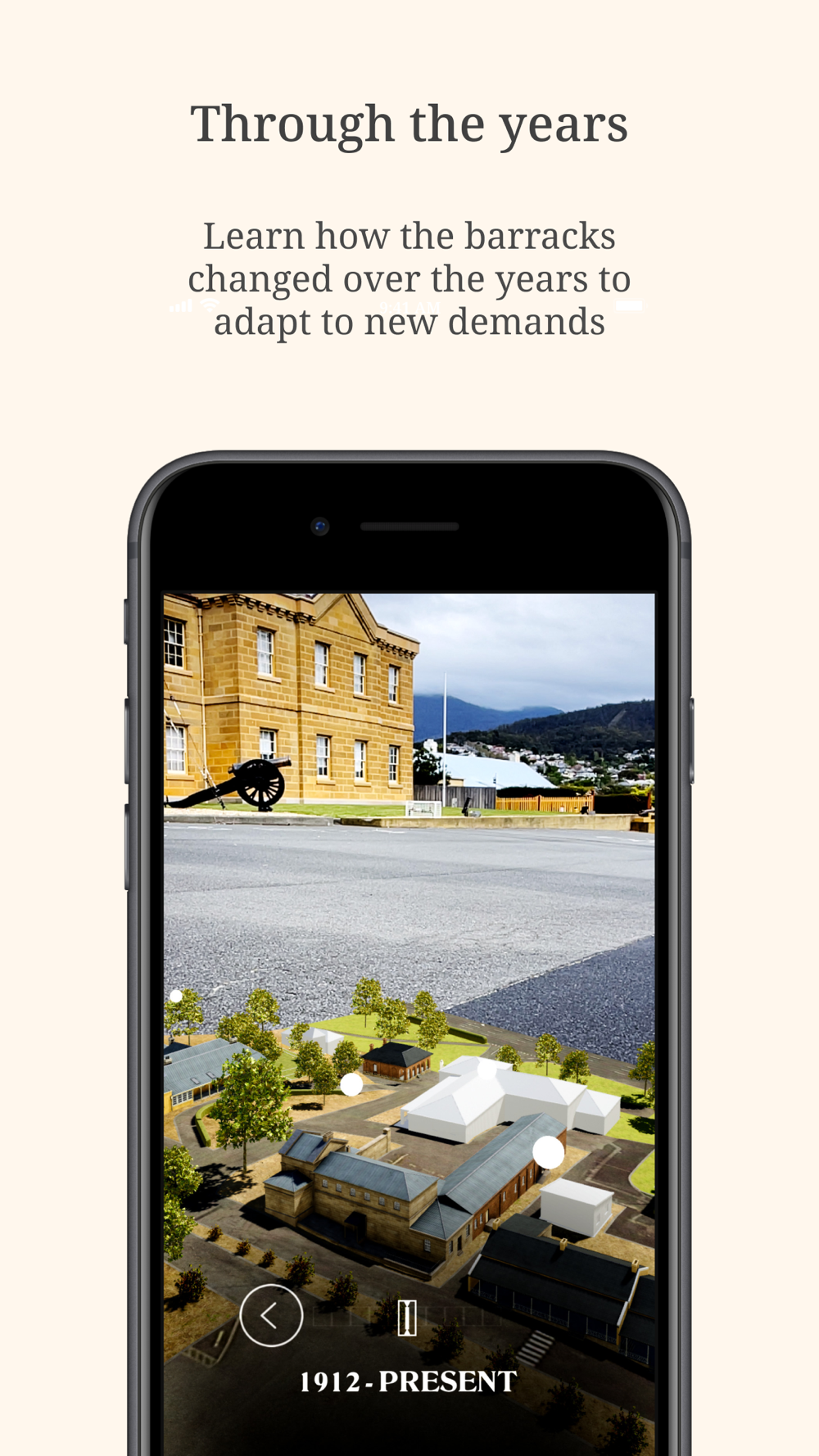 The app features voiceovers by Australian Army staff from the Army Musuem of Tasmania (located at the Barracks) explaining the various features which have been added over the years - giving a unique insight into the history of one of Australia's most significant historical military precincts.