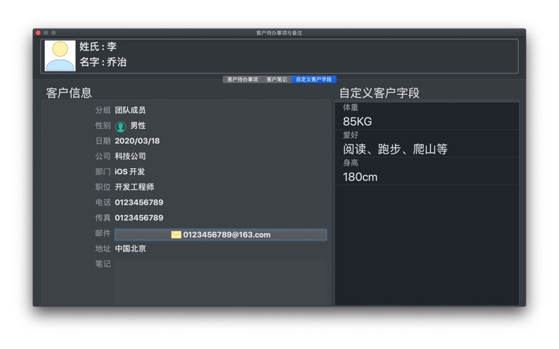 - 提供基础的客户属性(分组,头像,性别,名字,姓氏,出生日期,公司,部门,职位,电话,传真,邮件,地址,笔记等),您可以添加其他字段。