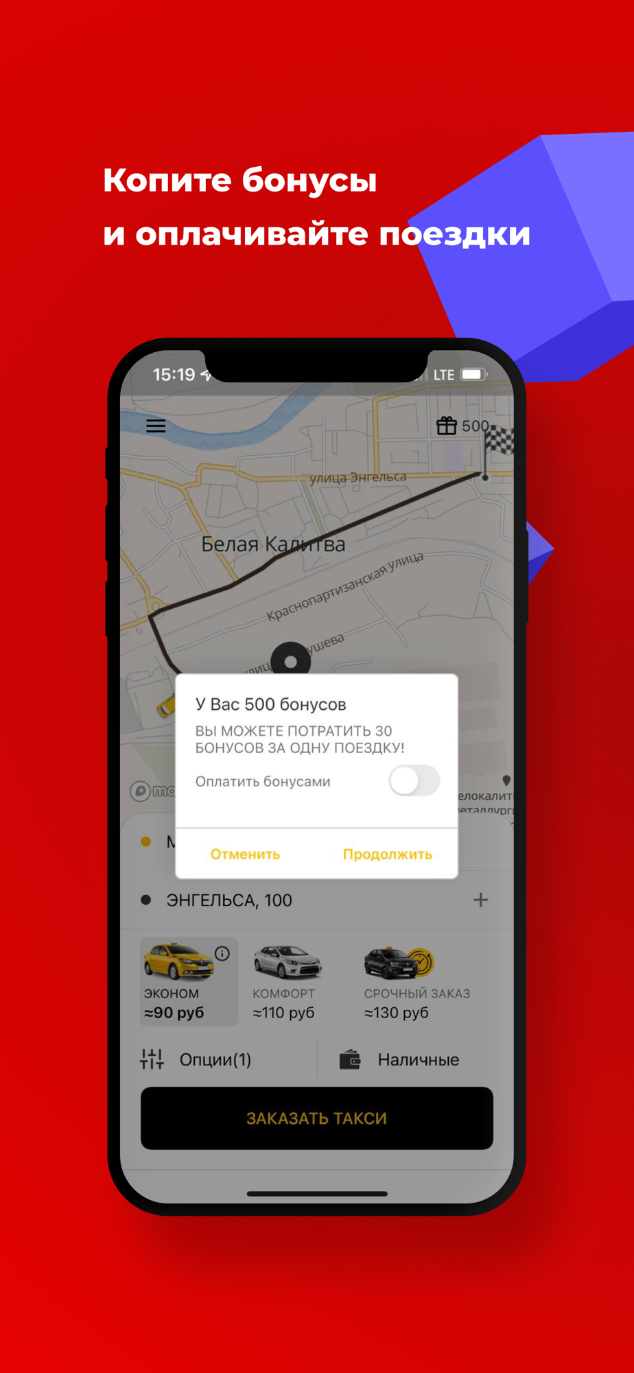 Возможна частичная оплата накопленными в приложении бонусами — максимум 30 рублей за одну поездку.