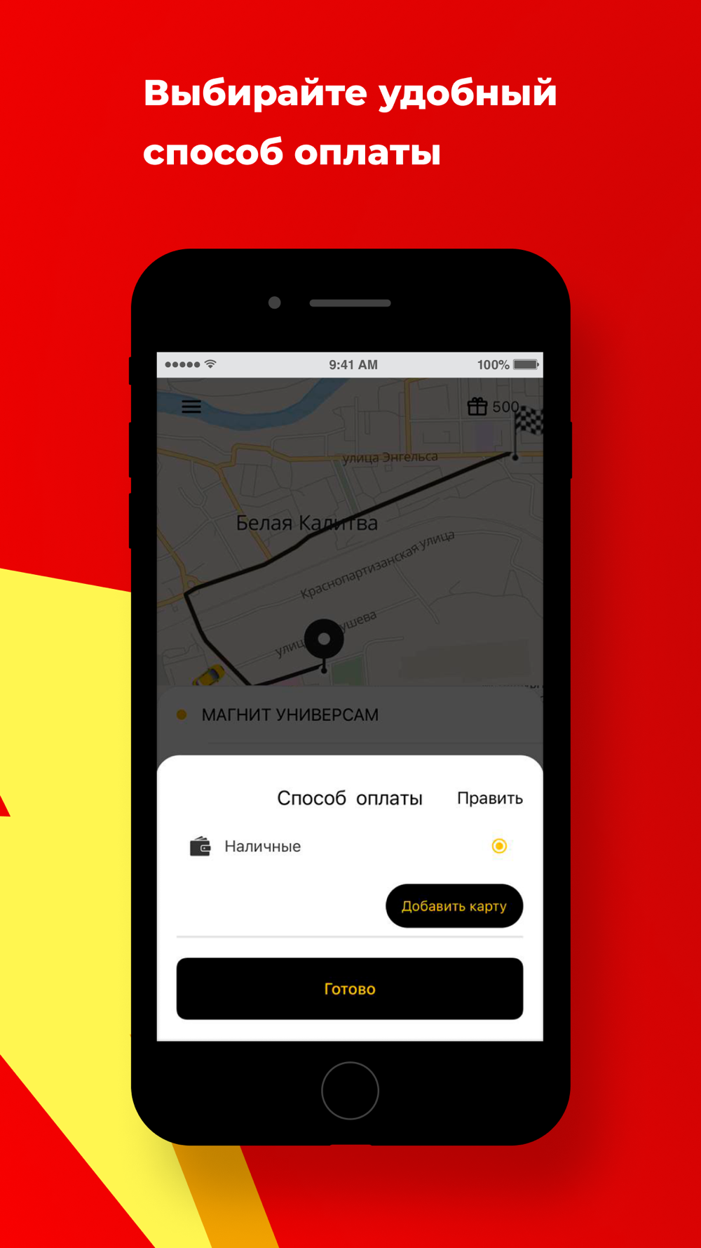 Выбирайте, как вам будет удобно оплатить такси в приложении: наличными, картой или переводом водителю.