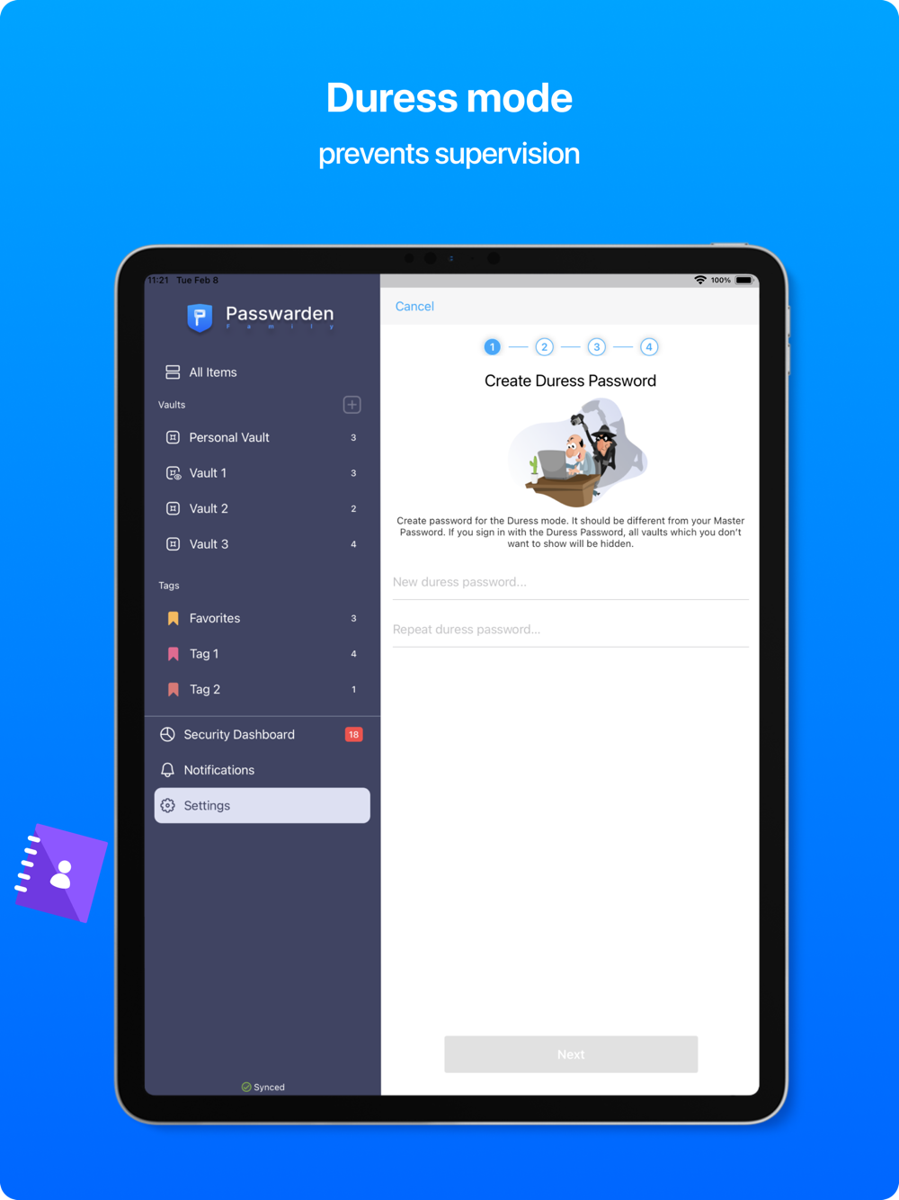 One more extremely secure feature of our password manager is Duress mode. It becomes essential in cases you have to open Passwarden under duress. To benefit from Duress mode, you need to create your Duress password and use it when anyone demands to open our password manager. As a result, there will be displayed only that data you’ve prepared for such situations.