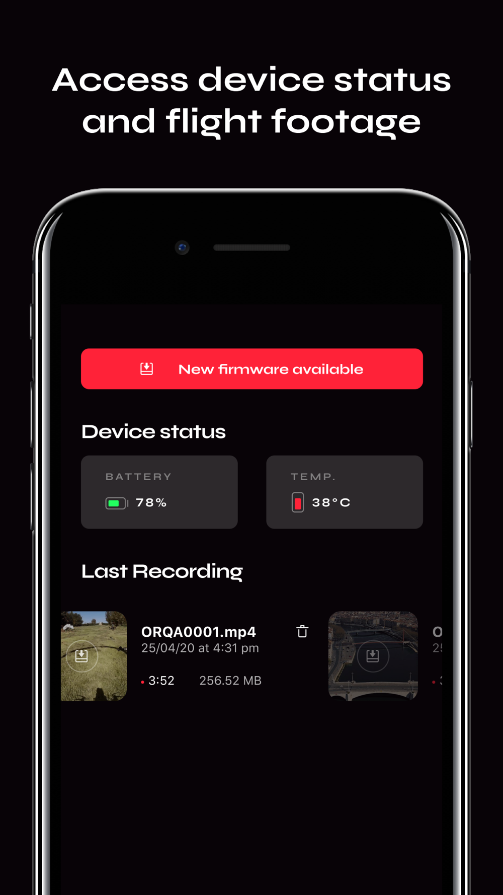 Download and install the latest firmware updates right from the Orqa FPV App. Maybe even stream your flight to your phone in real-time? Or live stream your single-pack session online? FPV.Connect features: