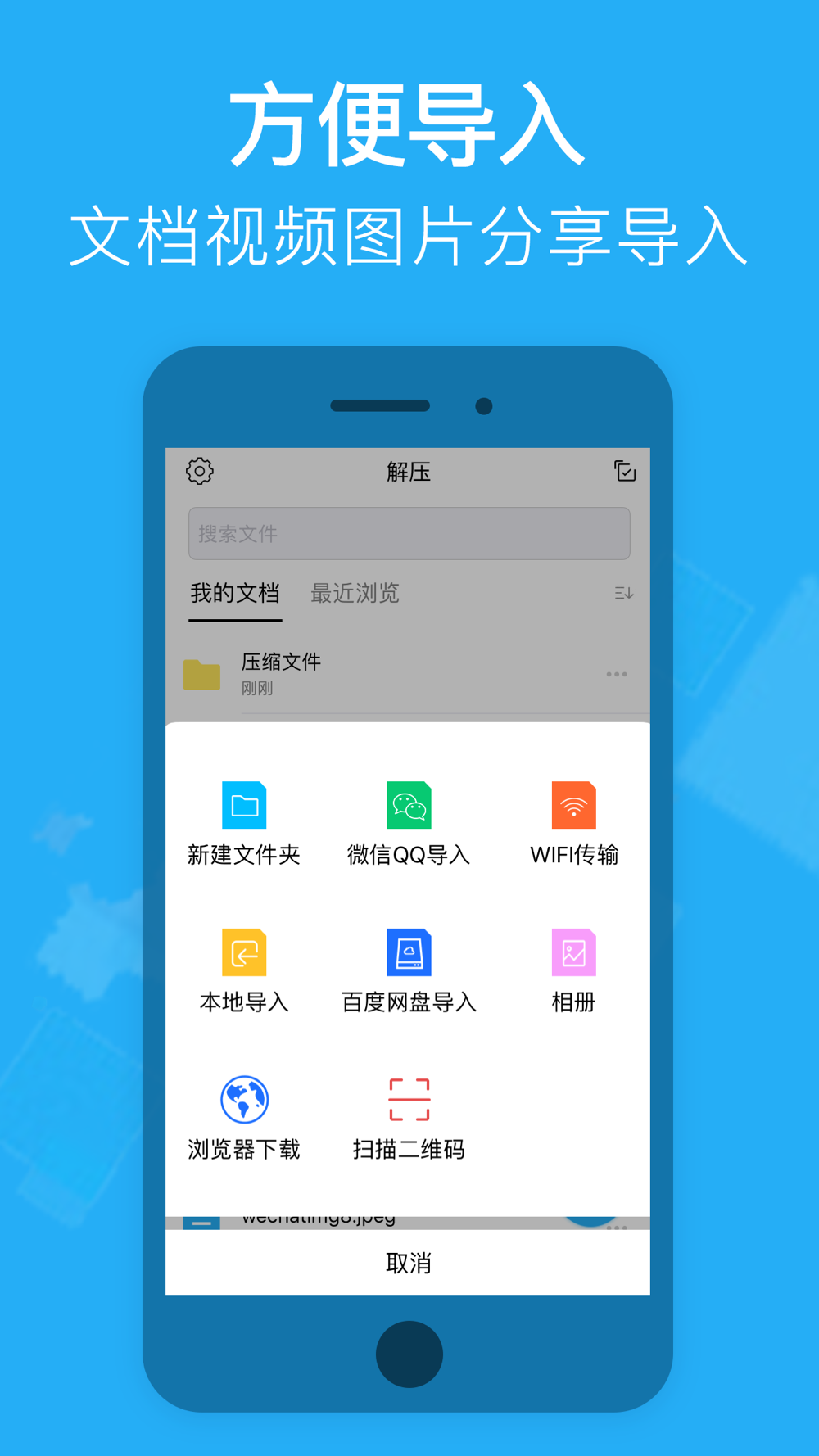 专业的rar、zip、7z文件解压缩及压缩工具,手机相册中的照片、视频也可轻松选择打包压缩。