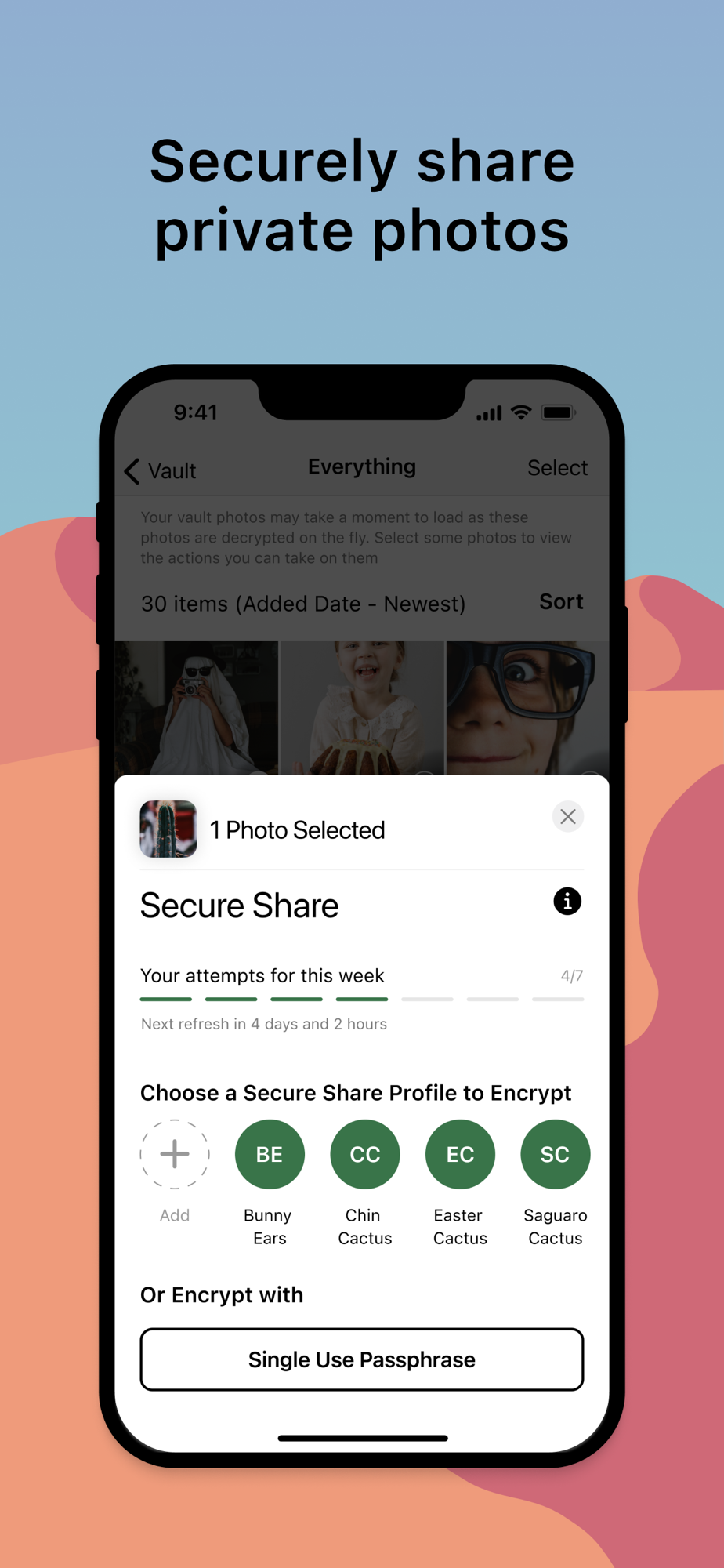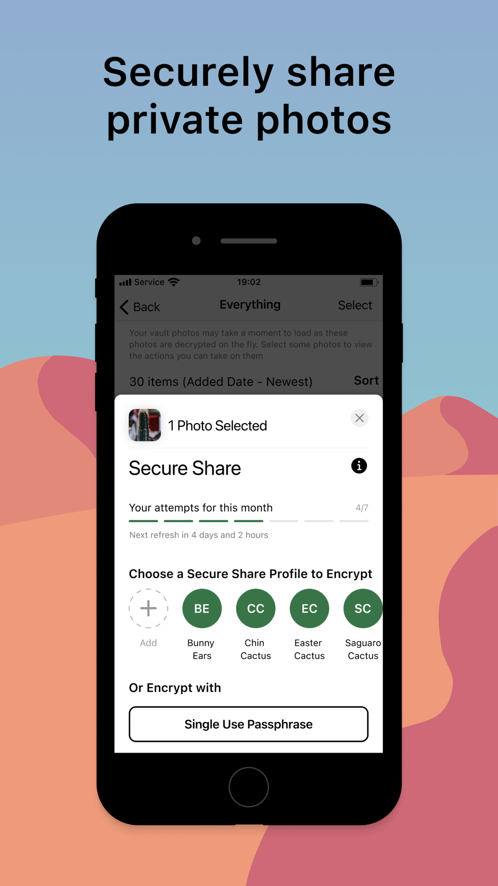 Store your private and intimate photos on Cacti's on-device 256-bit AES encrypted vault.