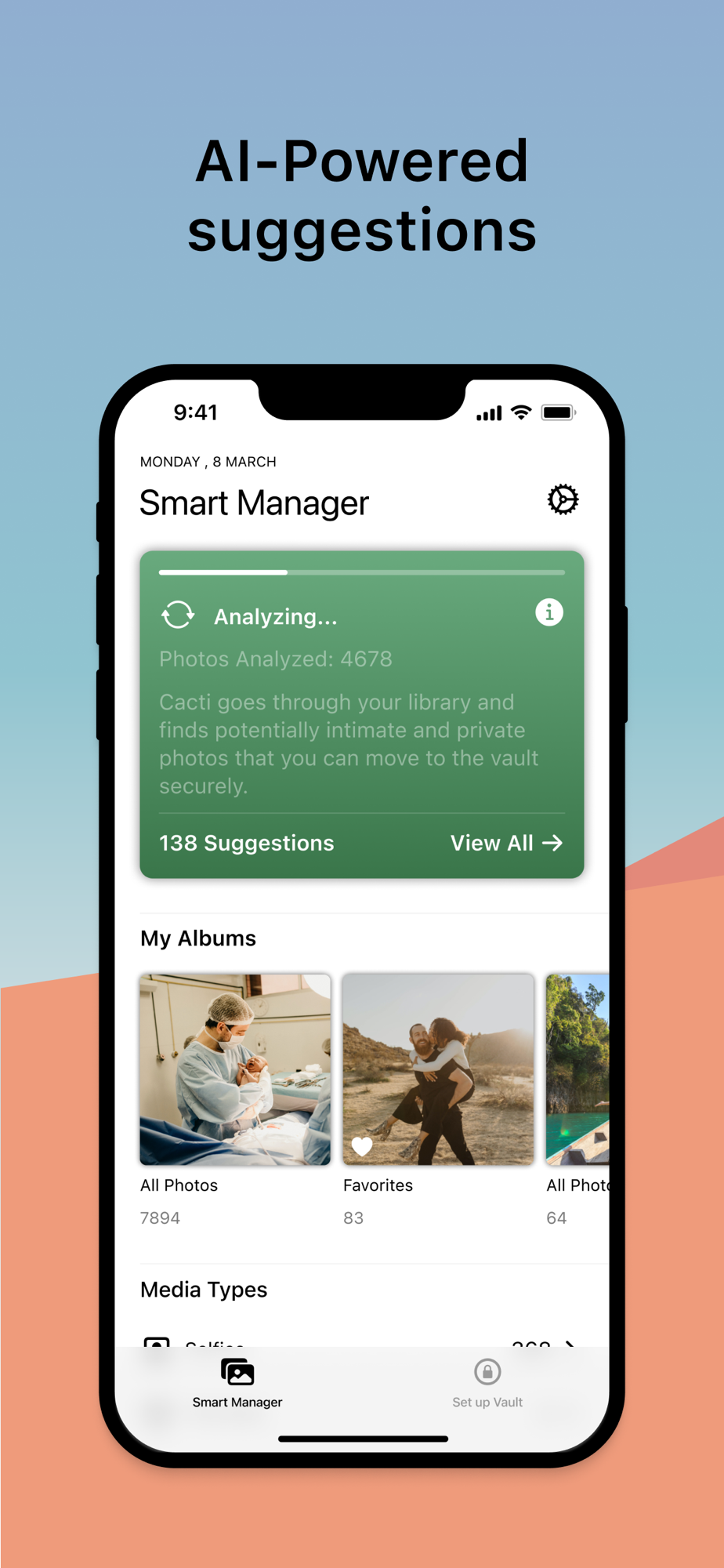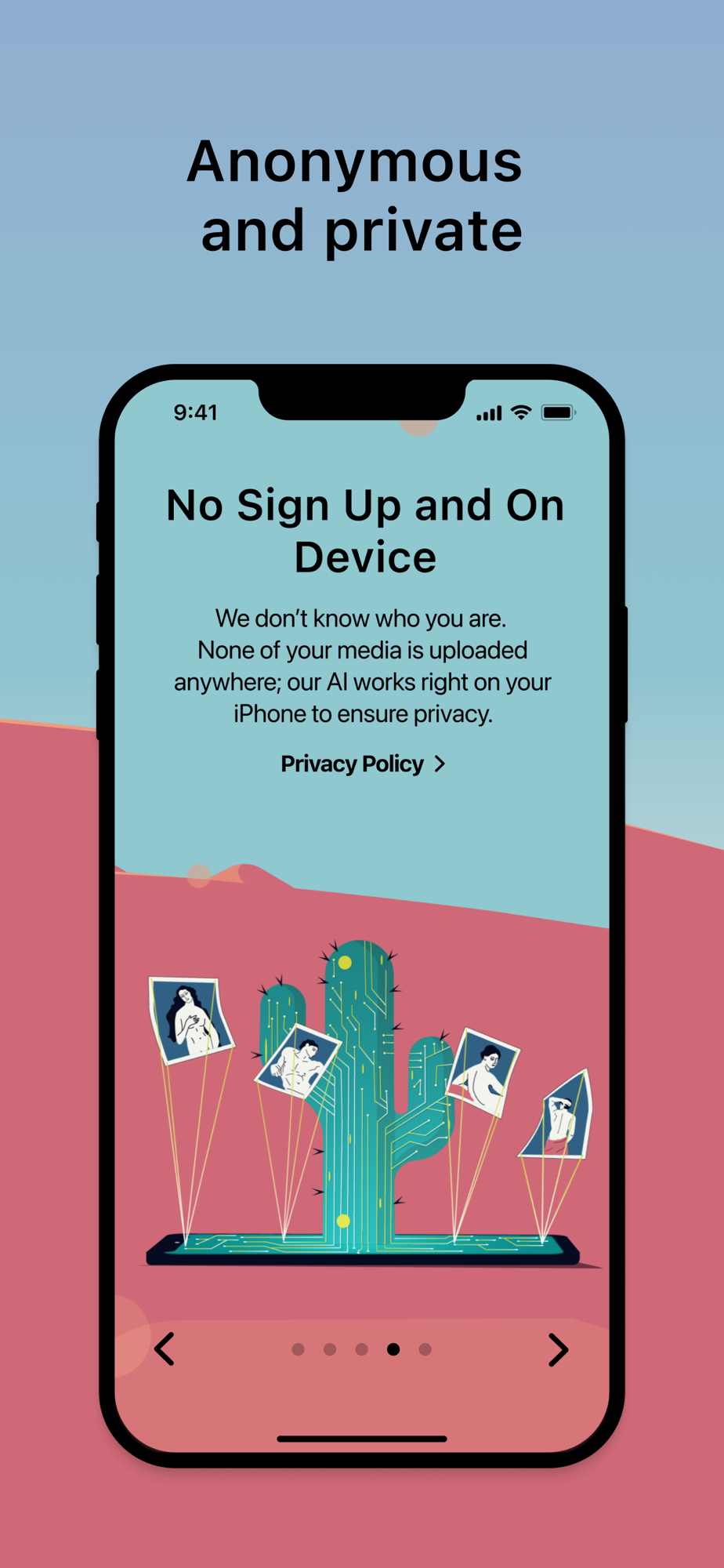 Cacti is powered by a strong AI to automatically detect private and intimate photos in your Photos Library. Our AI algorithm is years worth effort to help you find intimate photos easily. You don't have to browse through tens of thousands of your photos to find those that belong in a secure vault. Our algorithm will suggest photos that are most likely private and intimate so you can hide them in a few taps. The best part is that this AI algorithm works right on your device; your data never leaves your device; Cacti can work without access to the internet (provided your photos are not in iCloud).