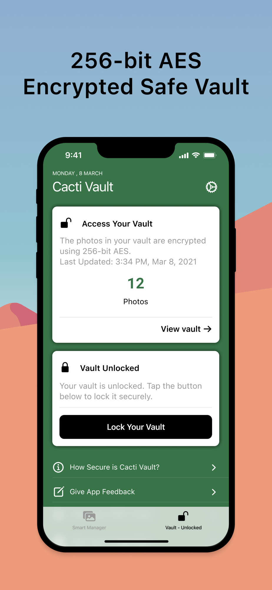 Cacti allows you to store your photos in a highly secure 256-bit AES encrypted vault to ensure the privacy and security you need. Cacti Vault is protected by your passphrase. You may also use Touch ID, or Face ID to unlock your vault. You can also add photos that are not detected by our algorithm directly into the vault. To ensure there is no possible hacking, we do not allow your data to leave your device. All photos remain securely stored in a passphrase protected encrypted vault on your device. They are not uploaded to our or any other servers at any time. This is the ultimate privacy tool.