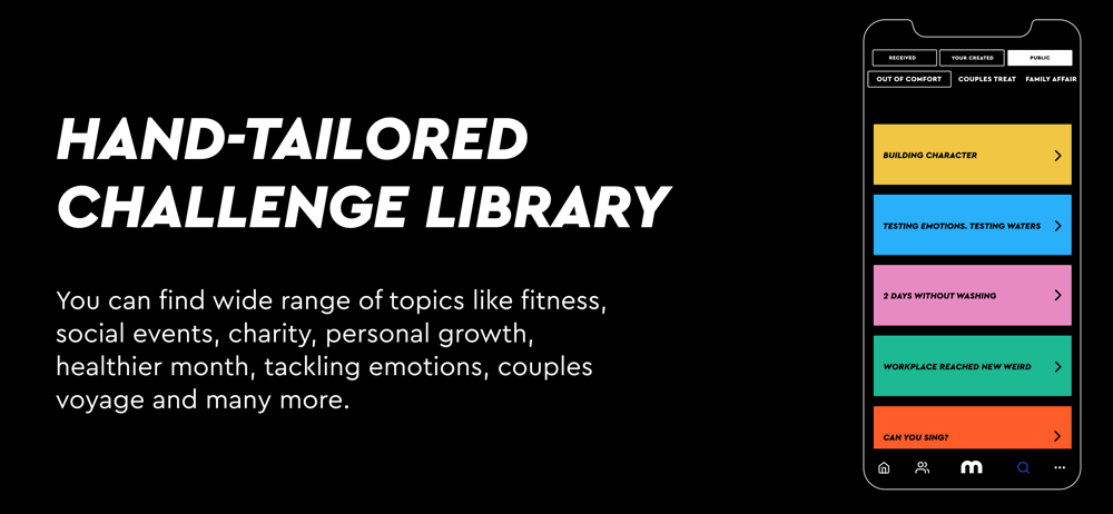 - Start by creating a custom challenge or pick one from our hand-tailored library covering a wide range of topics like fitness, social events, charity, personal growth, healthier month, tackling emotions, couples voyage and many more. There are plenty of challenges, that you can undertake by yourself or have a weekend challenge together with a friend or loved one.
