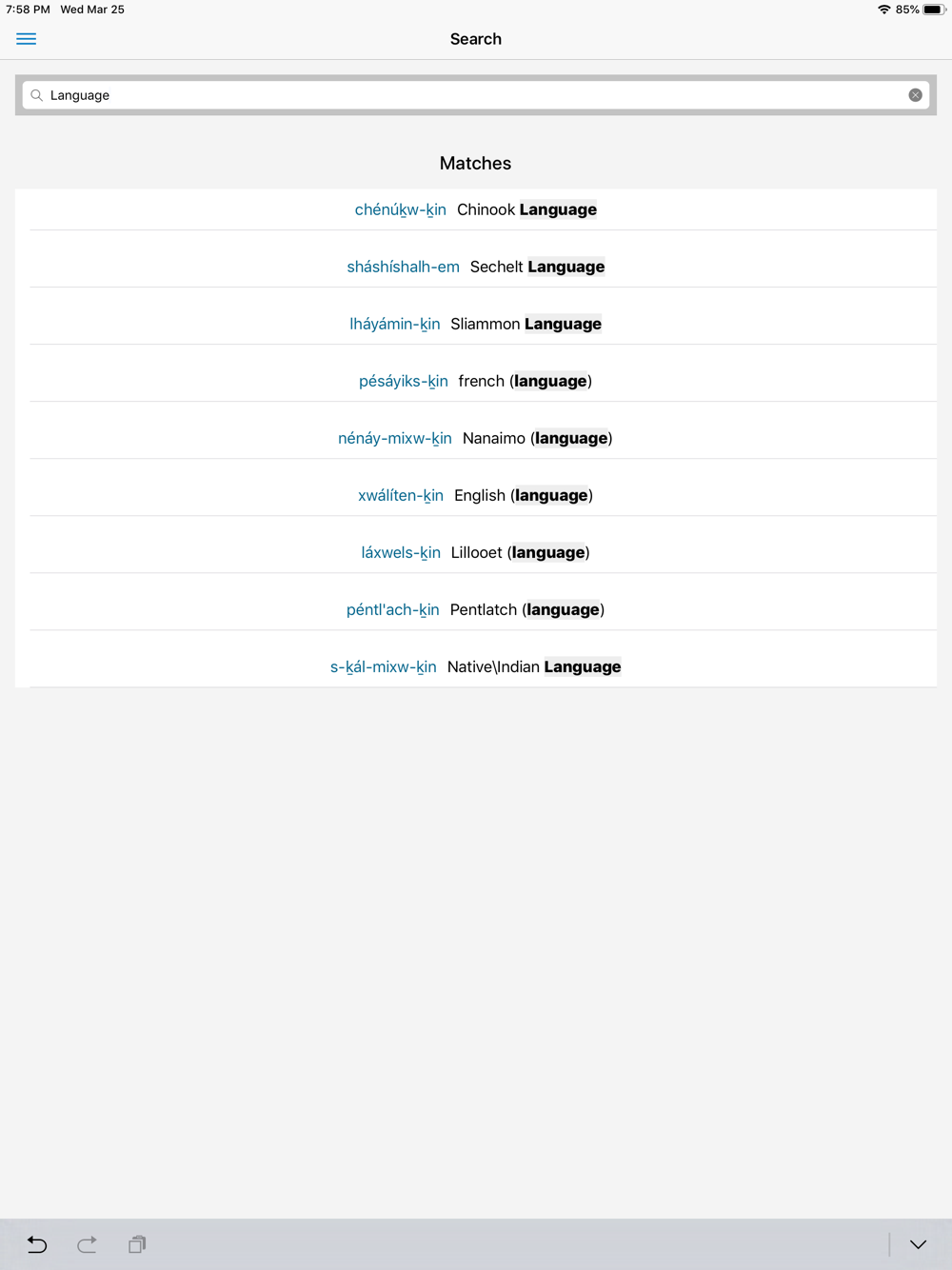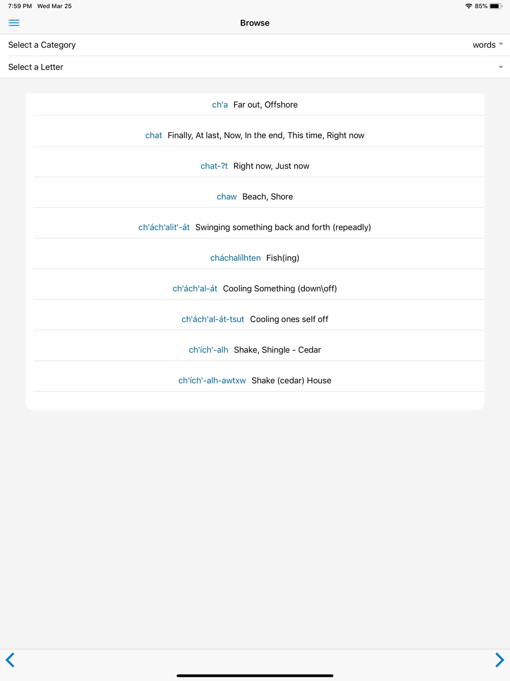 The she shashishalhem app is a media-rich bilingual dictionary and phrase collection comprised of words and phrases archived at the online language database FirstVoices.com. Word and phrase definitions are illustrated with audio recordings, images and videos. Editing features allow users to customize content by replacing default multimedia with personal pictures, videos and sounds using either the camera and microphone built into their device or images from their onboard photo collection.