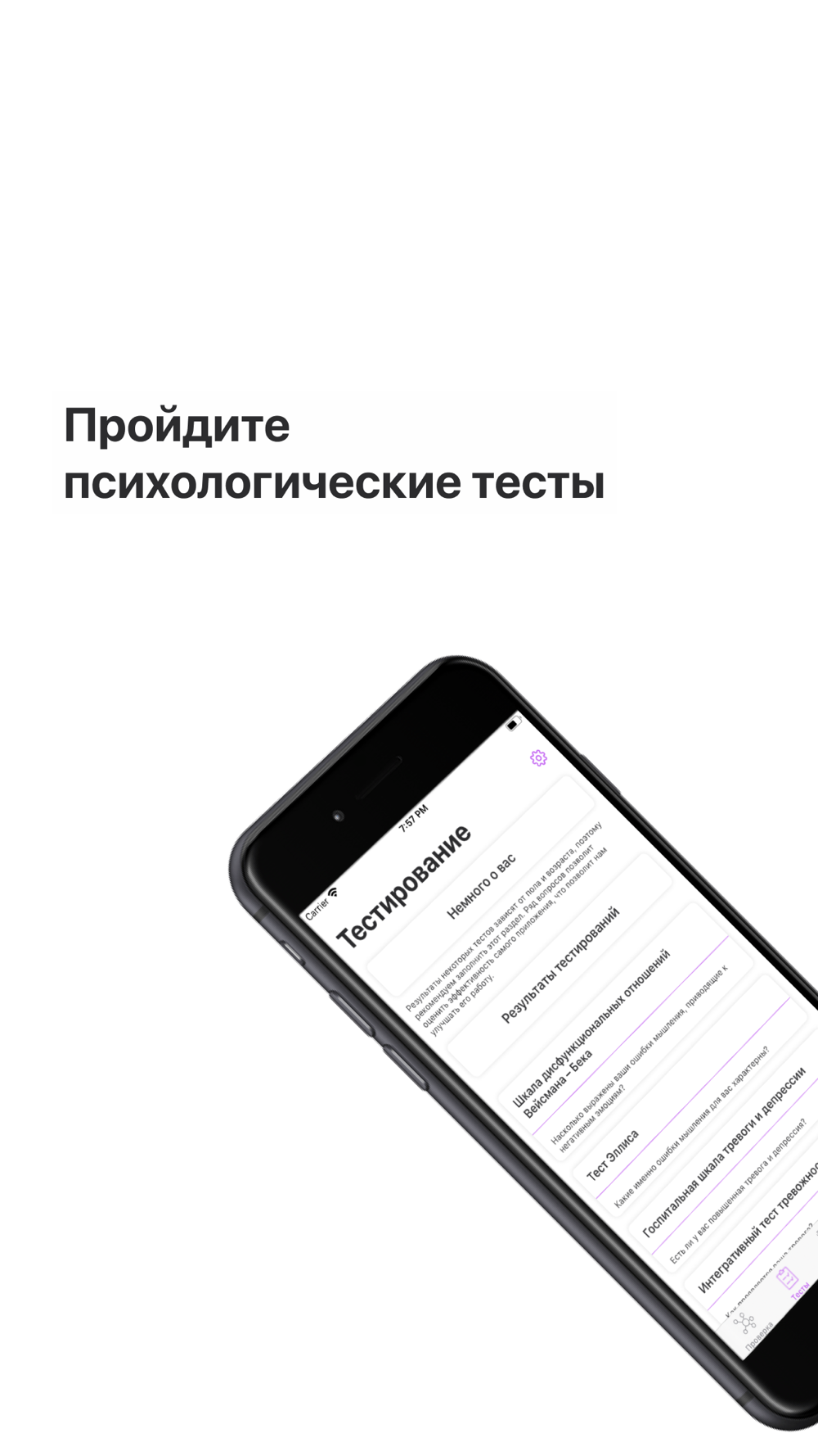 Вы сможете пройти тестирование и узнать, какие симптомы у вас сейчас есть, насколько они выражены. А также выявить присущие вам ошибки мышления и психологические механизмы, помогающие вам с ними справиться. Пройдя тестирование повторно через 1 месяц, 2 месяца и год, вы увидите, насколько приложение помогает вам. Вы можете дать согласие и стать анонимным участником исследования эффективности дистанционной самопомощи русскоязычным людям всего мира, а также позволите нам улучшить это приложение.
