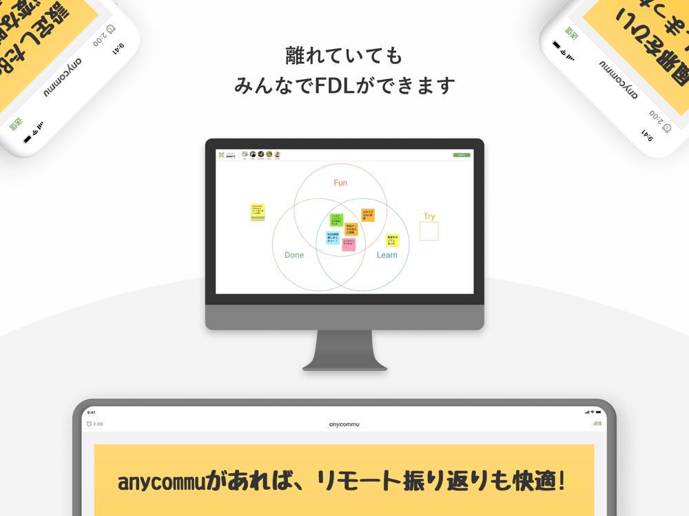 anycommu(エニコミュ)は、スクラムチームメンバーが、どこにいてもレトロスペクティブを実施できるアプリです