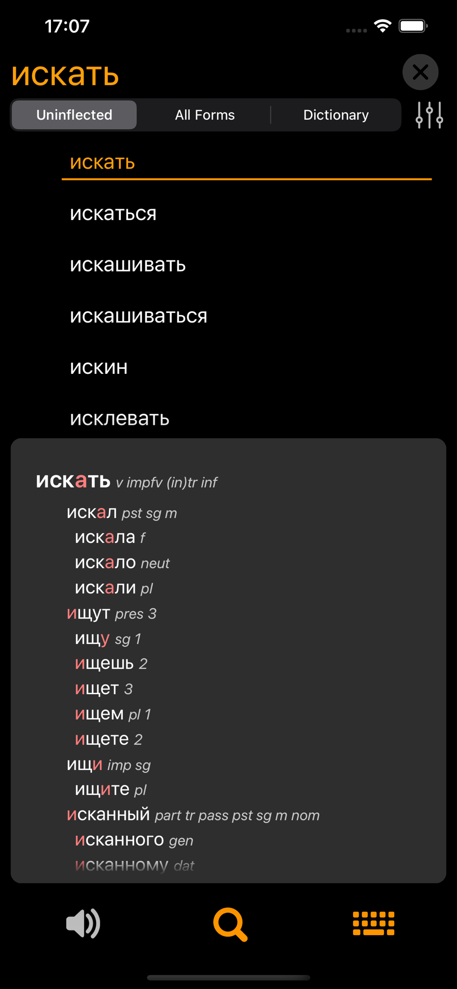* search through the dictionary (идти, слать, лёгкий) and derived (шла, шлёт, наилегчайший) word forms;