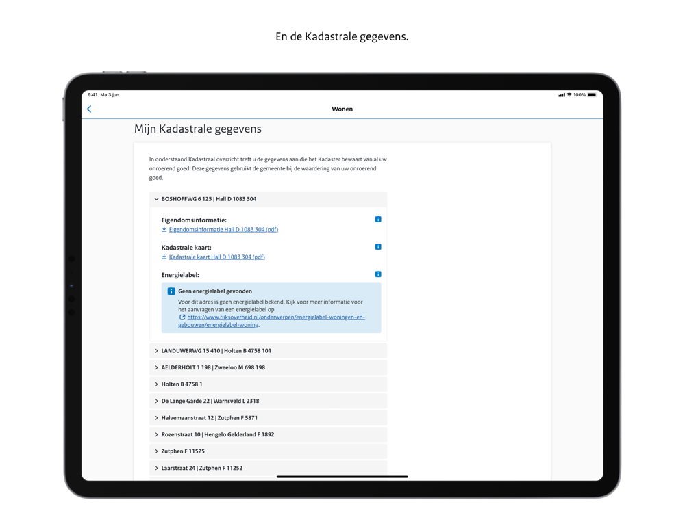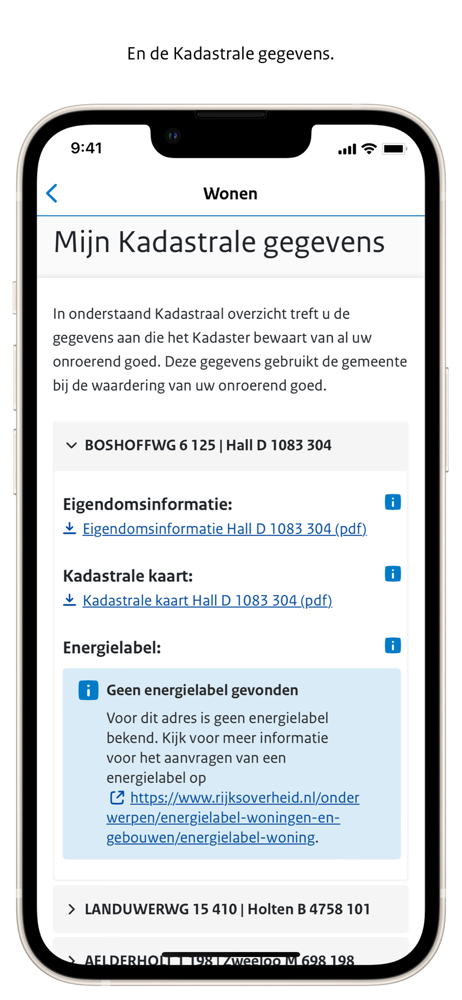 Snel uw energielabel opzoeken of uw inkomstengegevens controleren? Uw persoonlijke gegevens uit MijnOverheid staan nu handig en overzichtelijk in 1 app: de MijnGegevens app van MijnOverheid. Klopt er iets niet? In de app ziet u direct u hoe u uw gegevens kunt (laten) aanpassen. Belangrijke data zoals de verloopdatum van uw paspoort of identiteitsbewijs zet u via de app direct in uw eigen agenda.