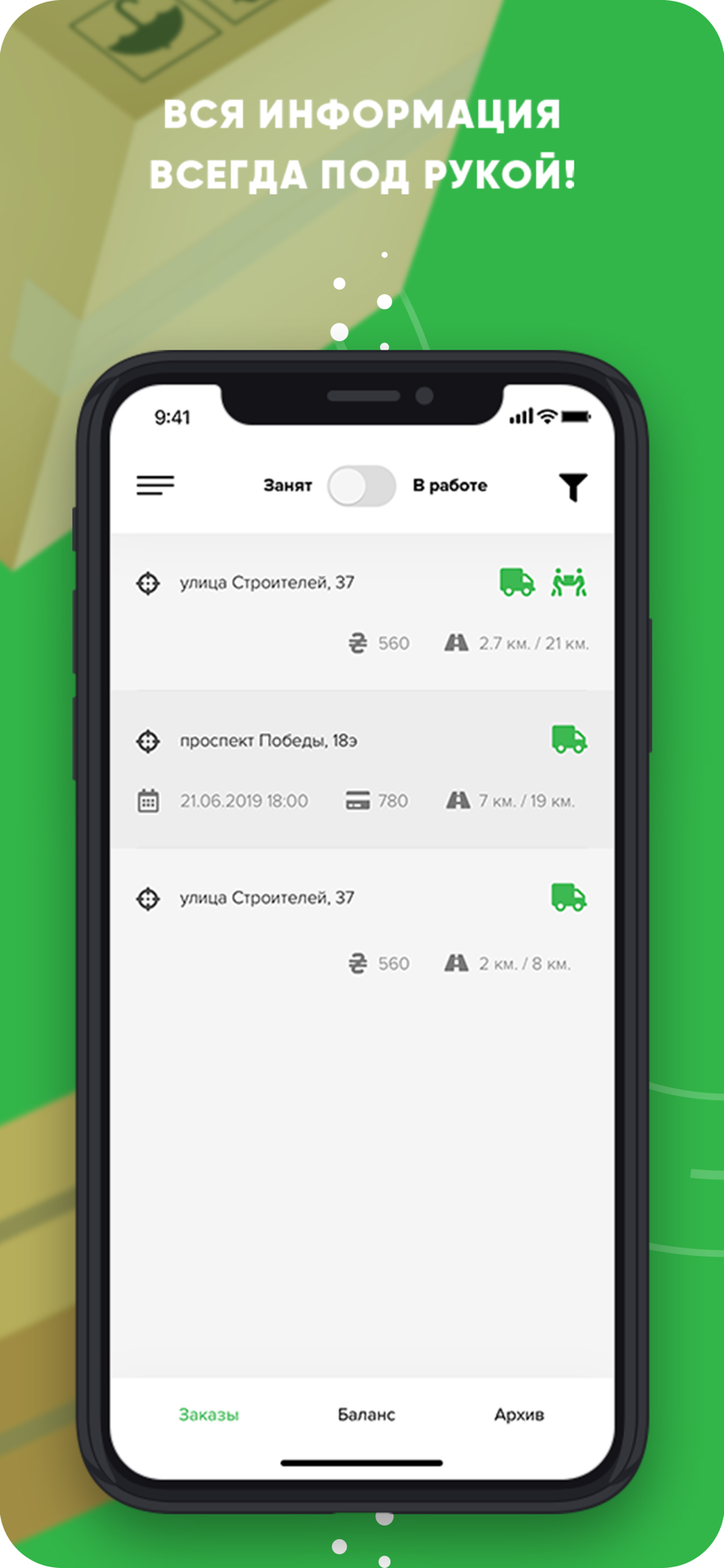 - отображение баланса исполнителя и взаиморасчетов с диспетчерской службой;