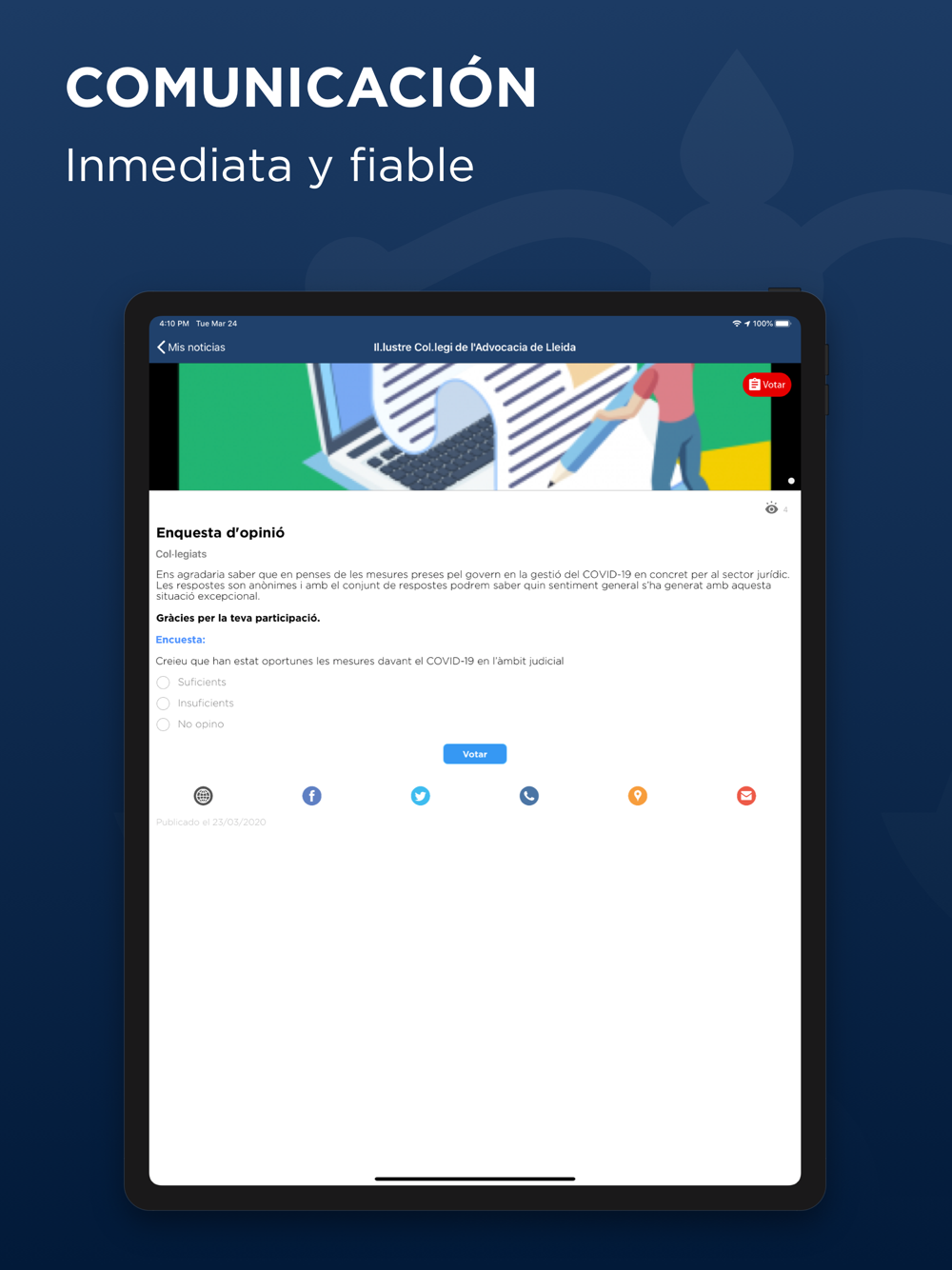 En un mundo cada vez más conectado, desde el Colegio de la Abogacía de Lleida creemos necesario aprovechar las funcionalidades que la tecnología pone a nuestro alcance, para brindar siempre el mejor servicio a los usuarios, ofreciendo información contrastada, inmediata y útil.