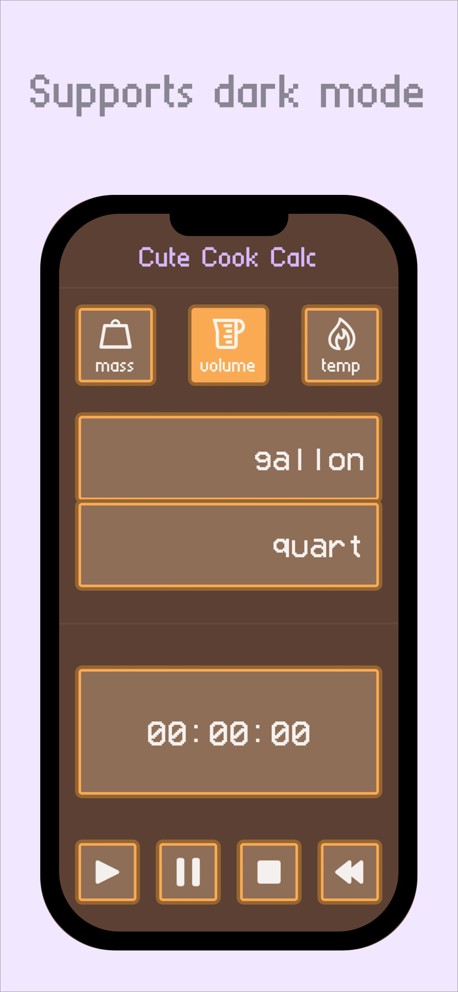 This cute and simple conversion calculator will help you cook and bake all in one app! Easily convert units from recipes to more convenient ones. Set a timer if needed. Tap a cooking unit to toggle through all options.