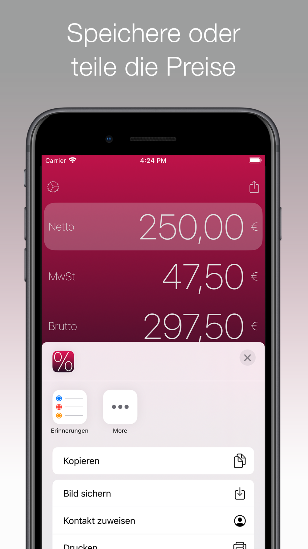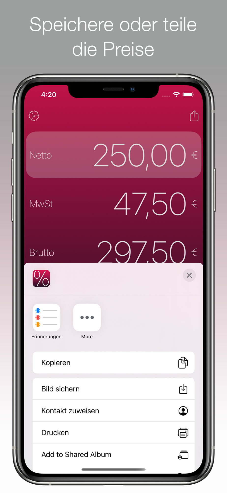 Eine Druckfunktion sowie eine allgemeine Share-Funktion der aktuellen Werte ist übrigens auch integriert. So lässt sich der errechnete Preis als Bild speichern, drucken, per Whatsapp oder E-Mail usw. verschicken.
