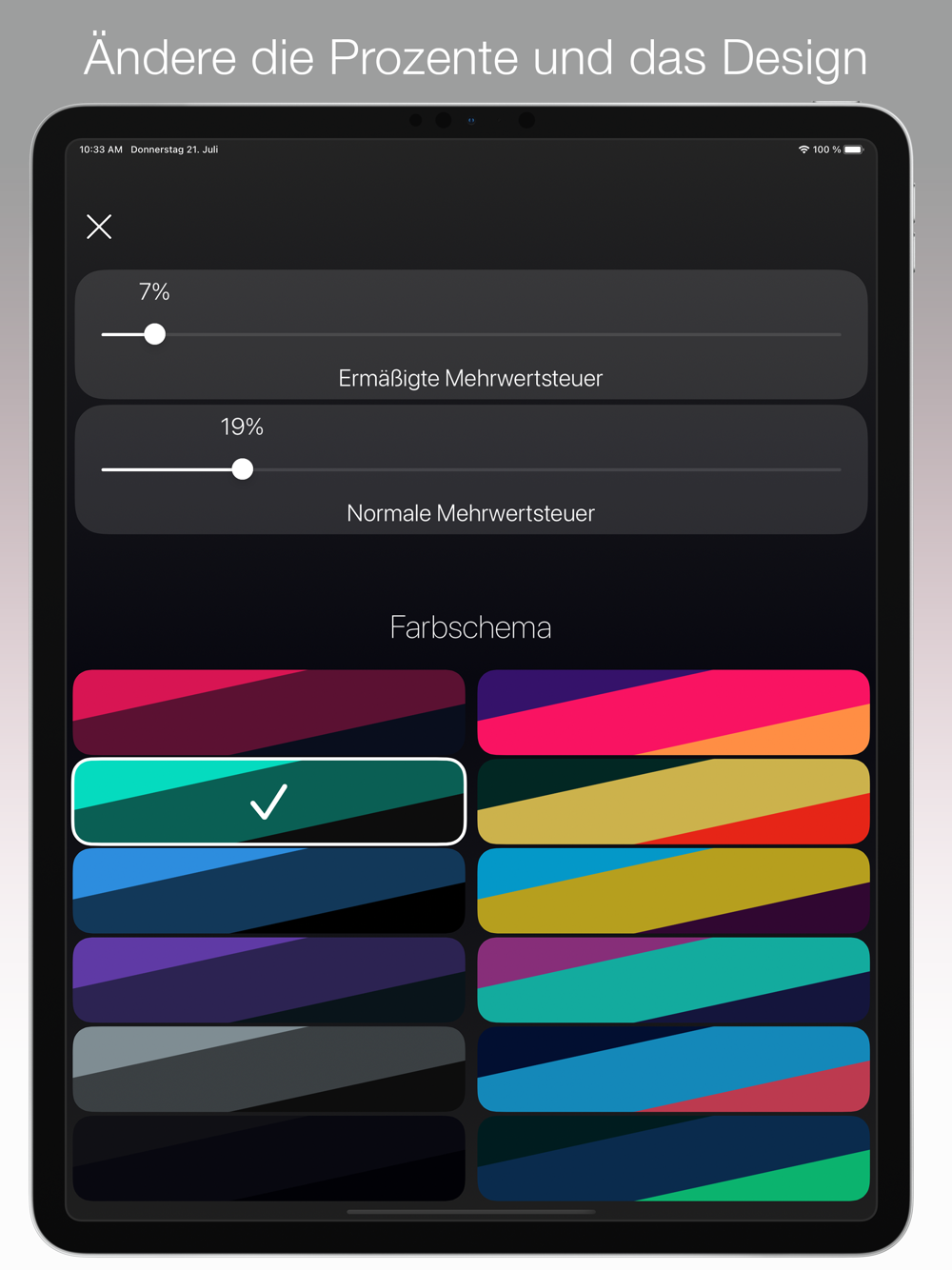 Die Mehrwertsteuersätze lassen sich - je nach Land - oder staatlicher Änderung jederzeit einstellen. Ebenso kommt der Rechner mit mehreren verschiedenen Farbvarianten daher, die sich an die individuellen Vorlieben anpassen lassen.