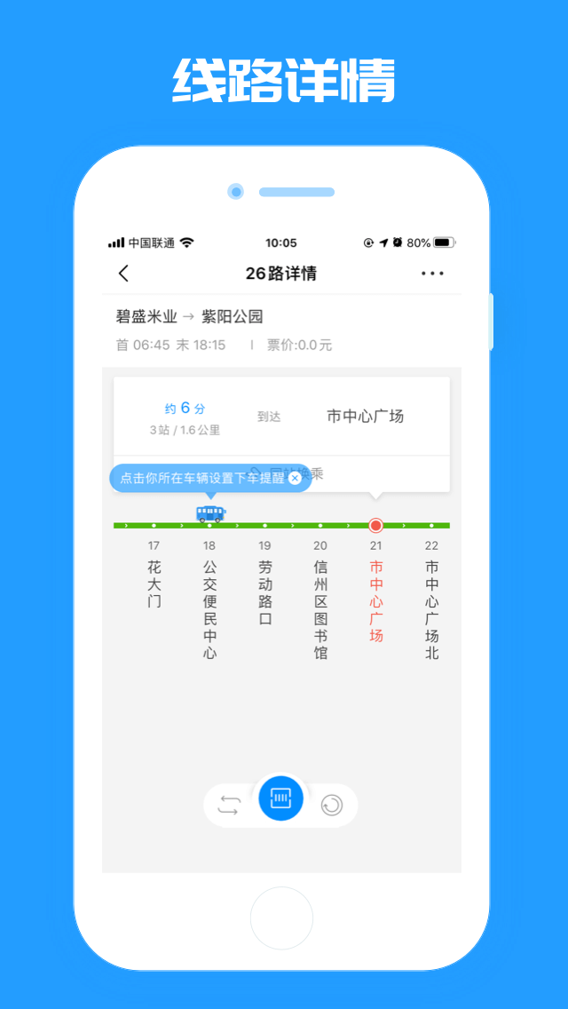 手机变身公交电子站牌,乘客秒变公交地图达人,随时随地查公交车实时位置、公交出行实时路况、提前规划公交地铁出行路线,车来了推送上车提醒,公交车到站推送下车提醒,再也不用时刻观望公交还有几站到,公交还有多久了....等车没烦恼