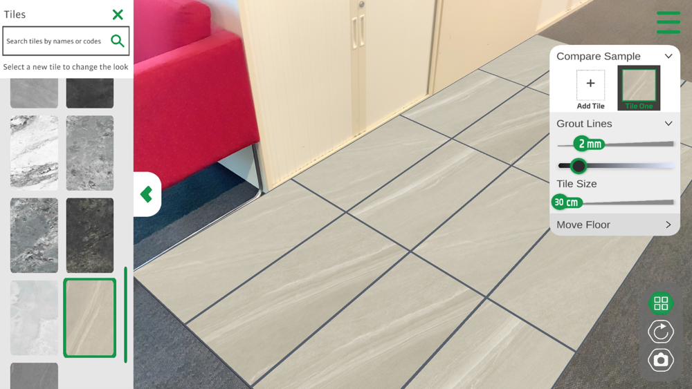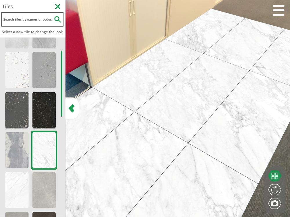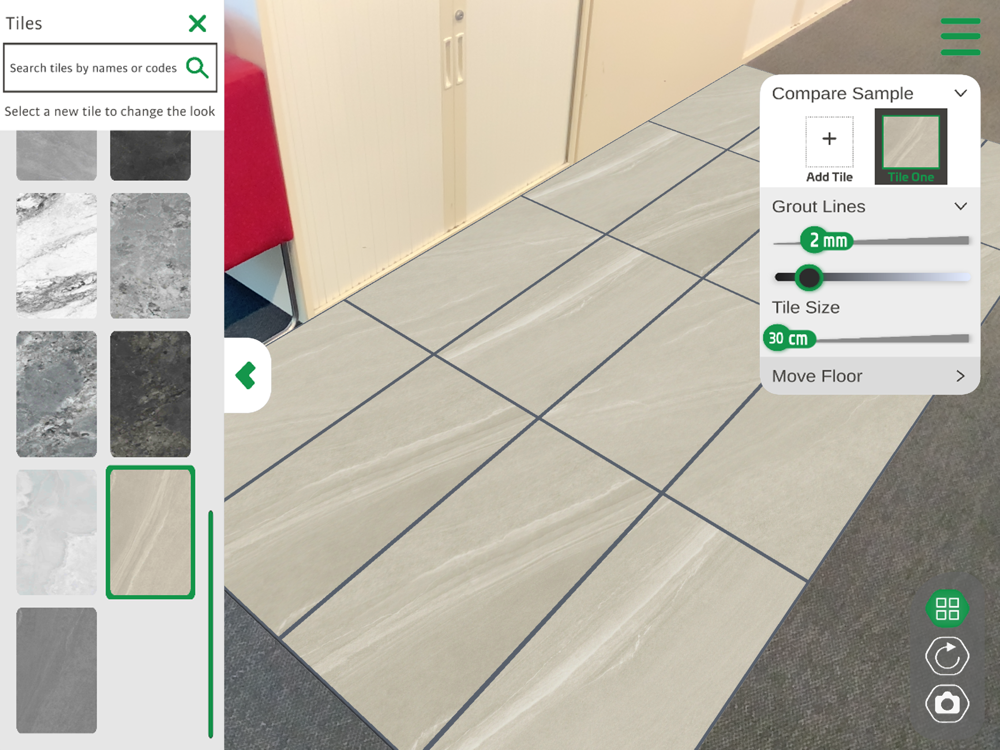 Preview dozens of unique tiles for your home using augmented reality. Chose from many amazing sets for your bathroom, kitchen, lounge, or any room you like.