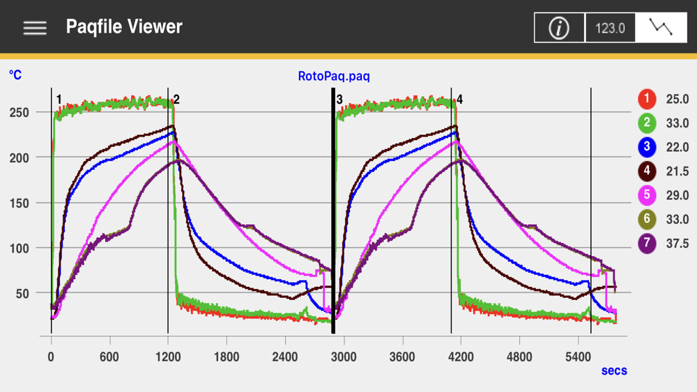 The Datapaq Paqfile Viewer enables the user to display, analyse and share temperature profiles generated using all Datapaq thermal profiling systems. In addition to zooming into the graphical results, the user can see the temperature measurements from every thermocouple at every sample point. To assist in analysis of results the app will display maximum temperature for each thermocouple and the user can add a temperature threshold calculation for further profile analysis.