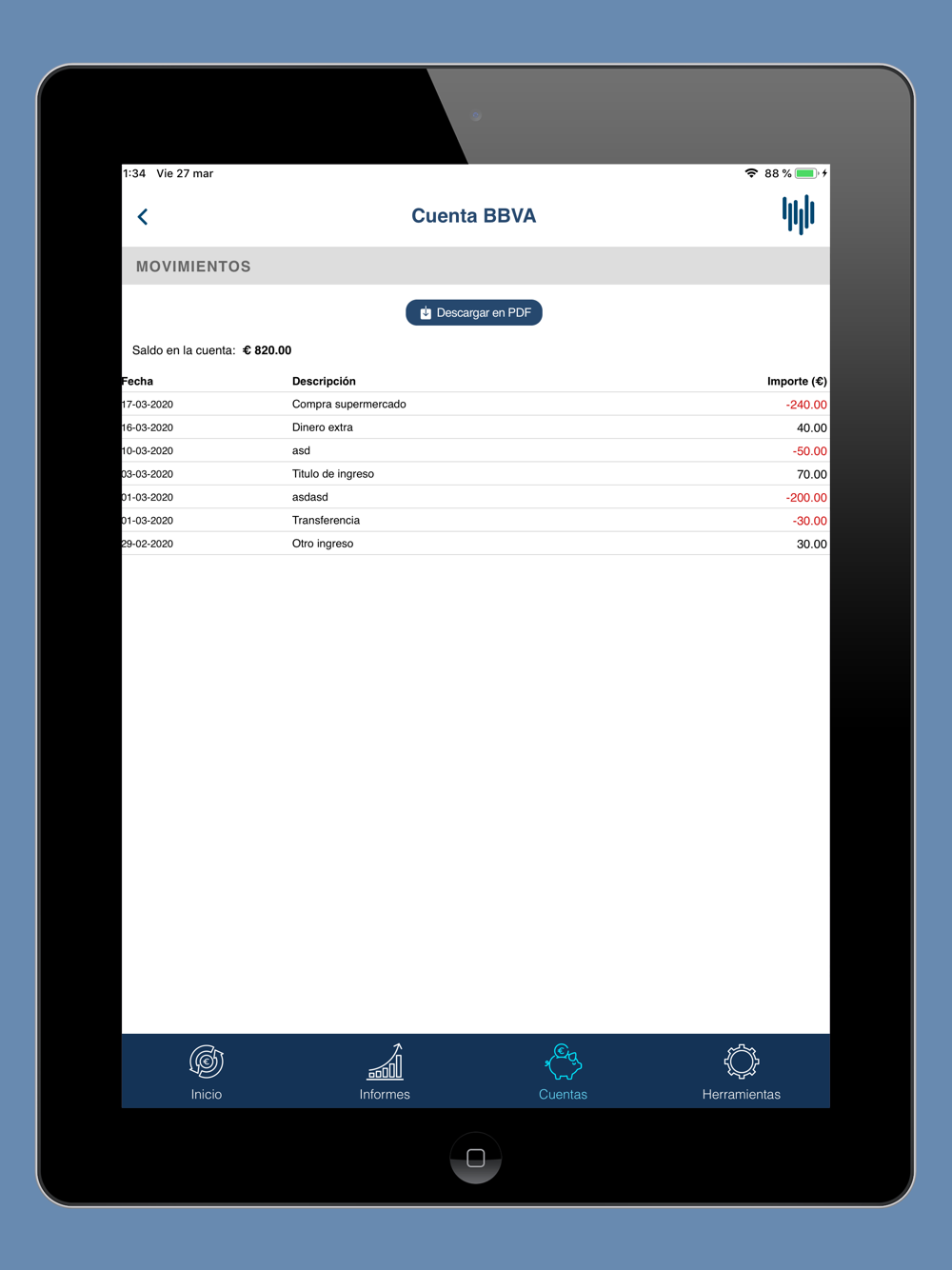 Tendrás un informe detallado de todos los ingresos y gastos a lo largo de los meses, además de poder verlos separados por categorías y cuentas, y desglosados mensualmente. Además podrás descargar en PDF todos los informes, tanto mensuales como anuales.