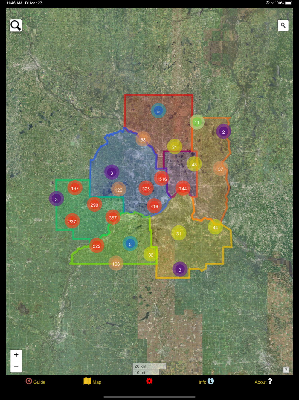 Navigate an interactive map of nearly 5000 points representing the locations of surveyed nuclear fallout shelters across the 7-county metropolitan area of the Twin Cities. This includes the Minnesota counties of Anoka, Carver, Dakota, Hennepin, Ramsey, Scott, and Washington. The population centers of Minneapolis and Saint Paul constitute over half of the shelter locations.