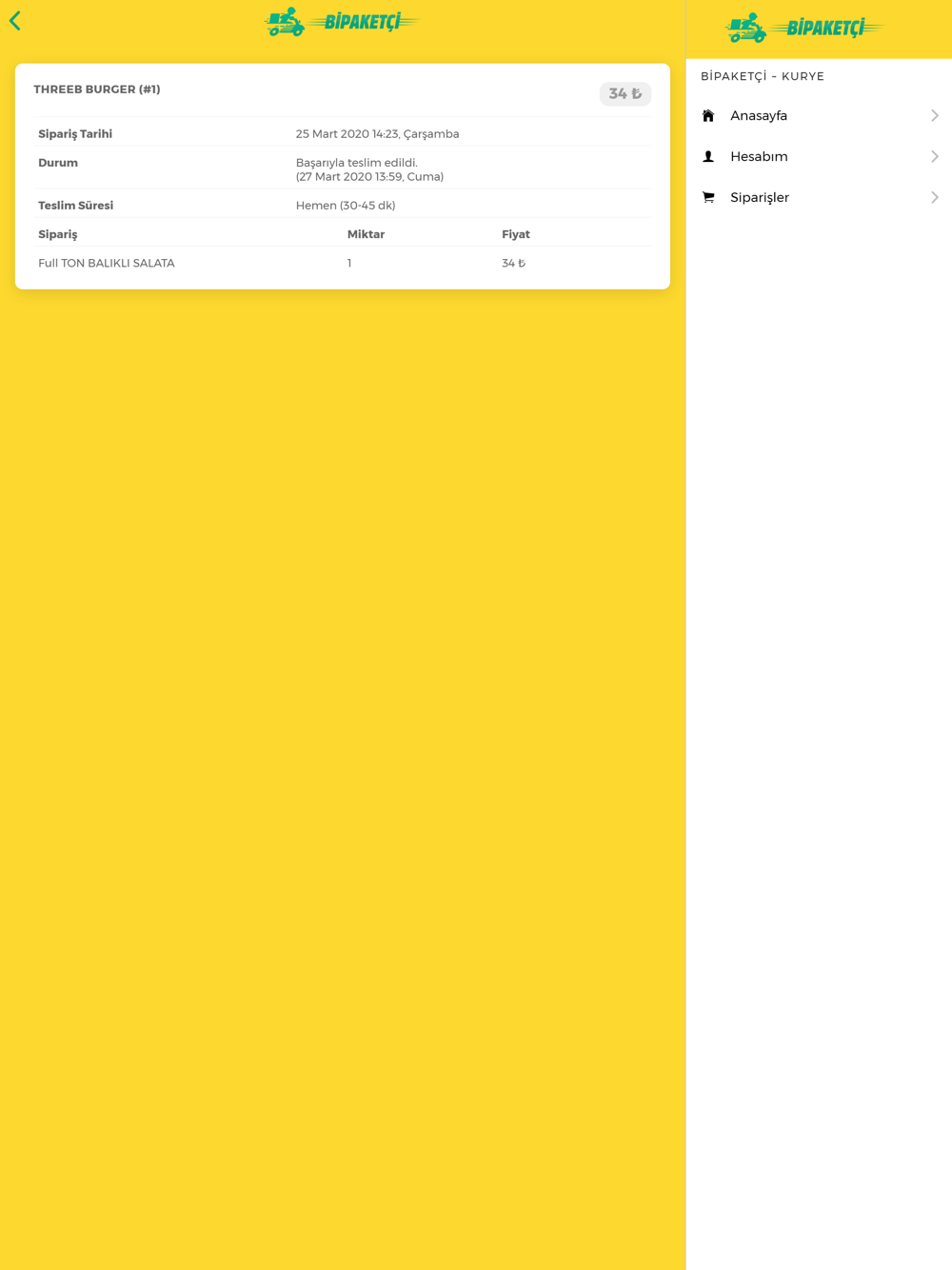 Bipaketçi uygulamasının teslimat işlemlerini yapan kuryeler için sipariş ve teslimat takibini daha hızlı ve kolay yapabilmesi için özel olarak hazırlanmış olan mobil uygulamasıdır.