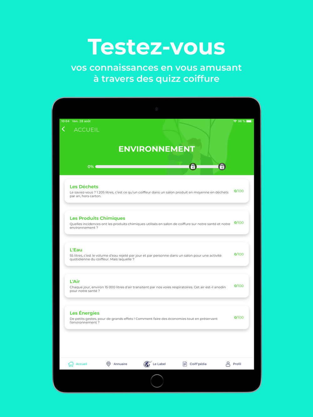 Testez votre Culture en Coiffure, répondez à de nombreux quizz sur l'environnement, la nutrition et la santé dans les salons de coiffure.