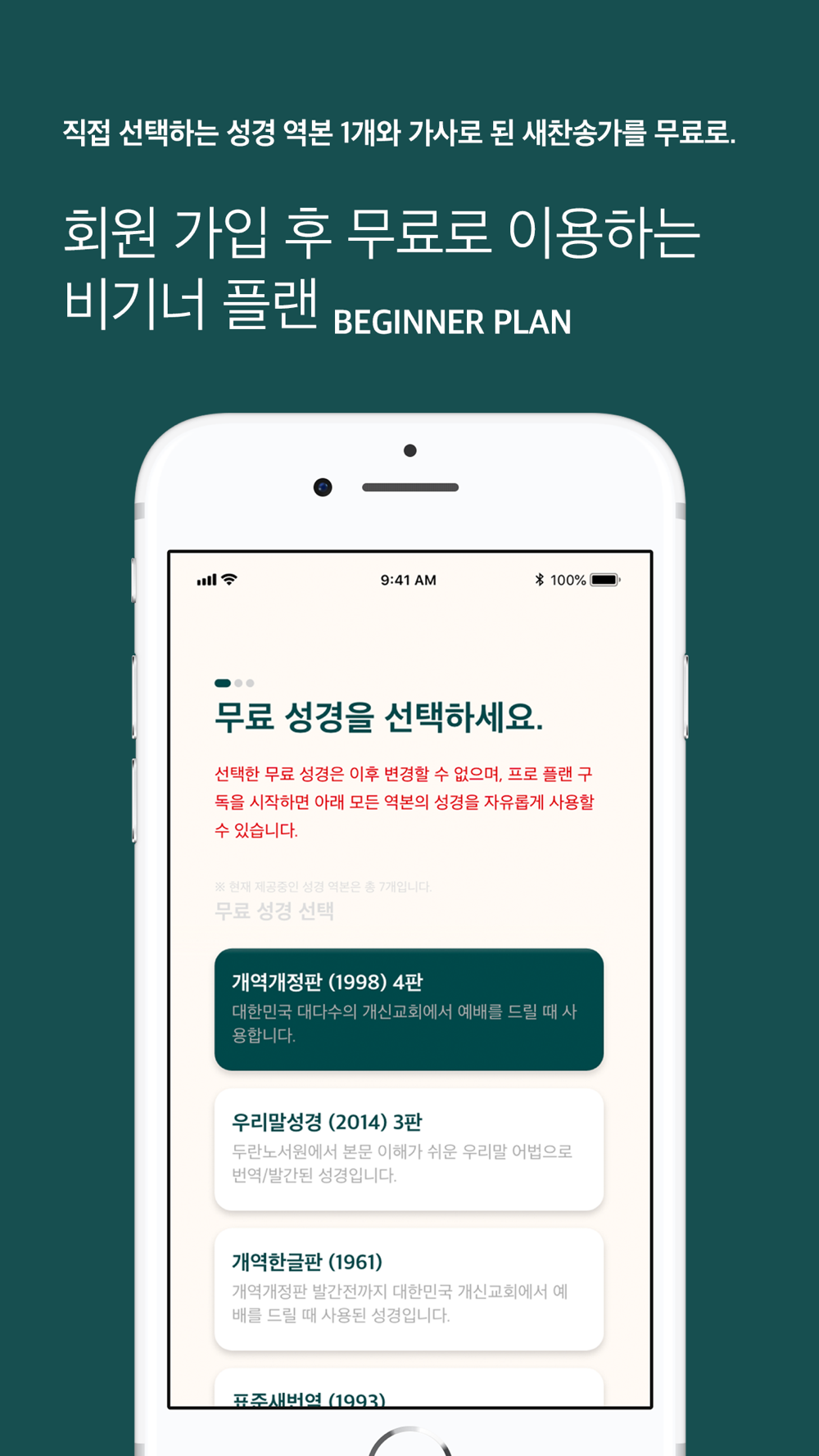 - 사용자 본인이 직접 선택한 성경 역본 1개 평생 무료.
