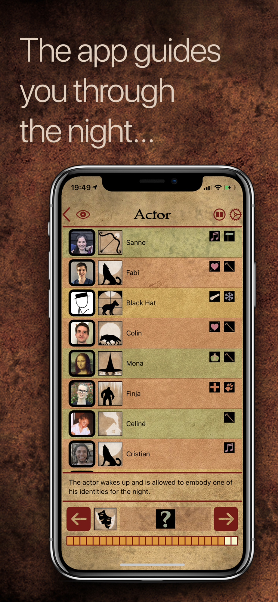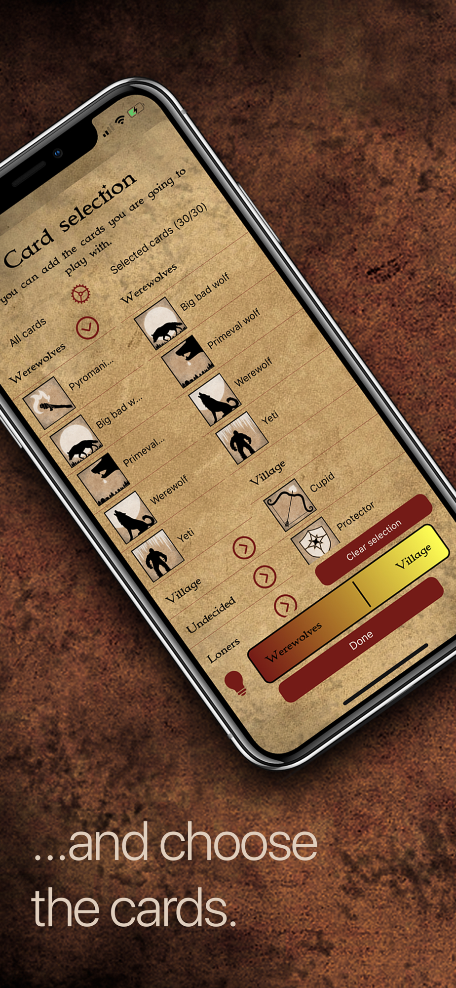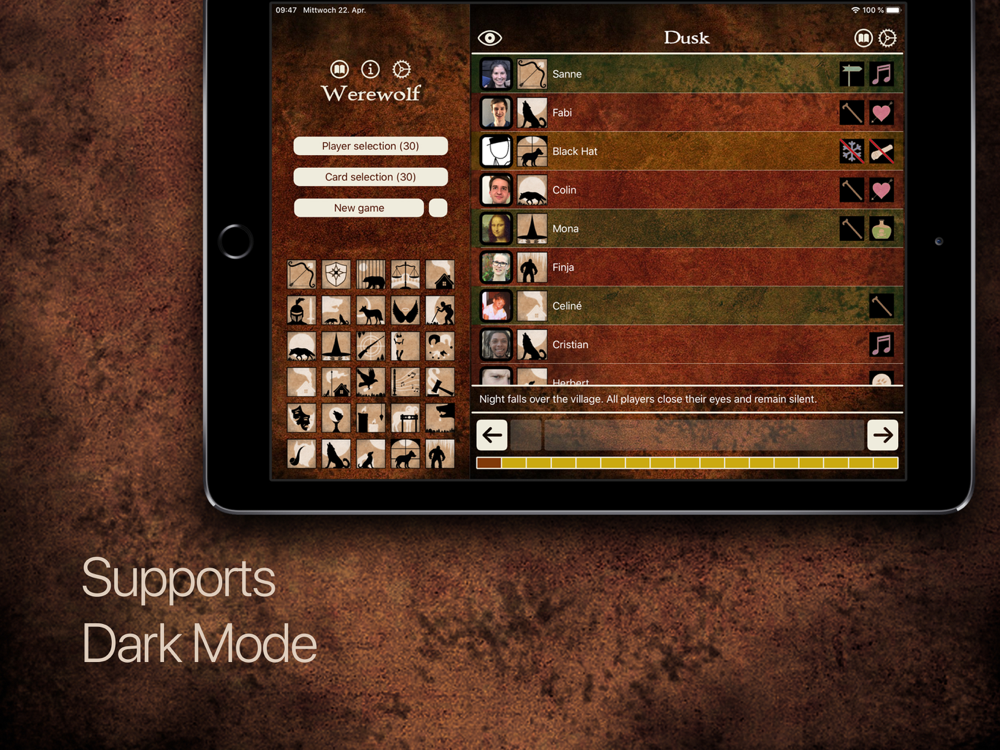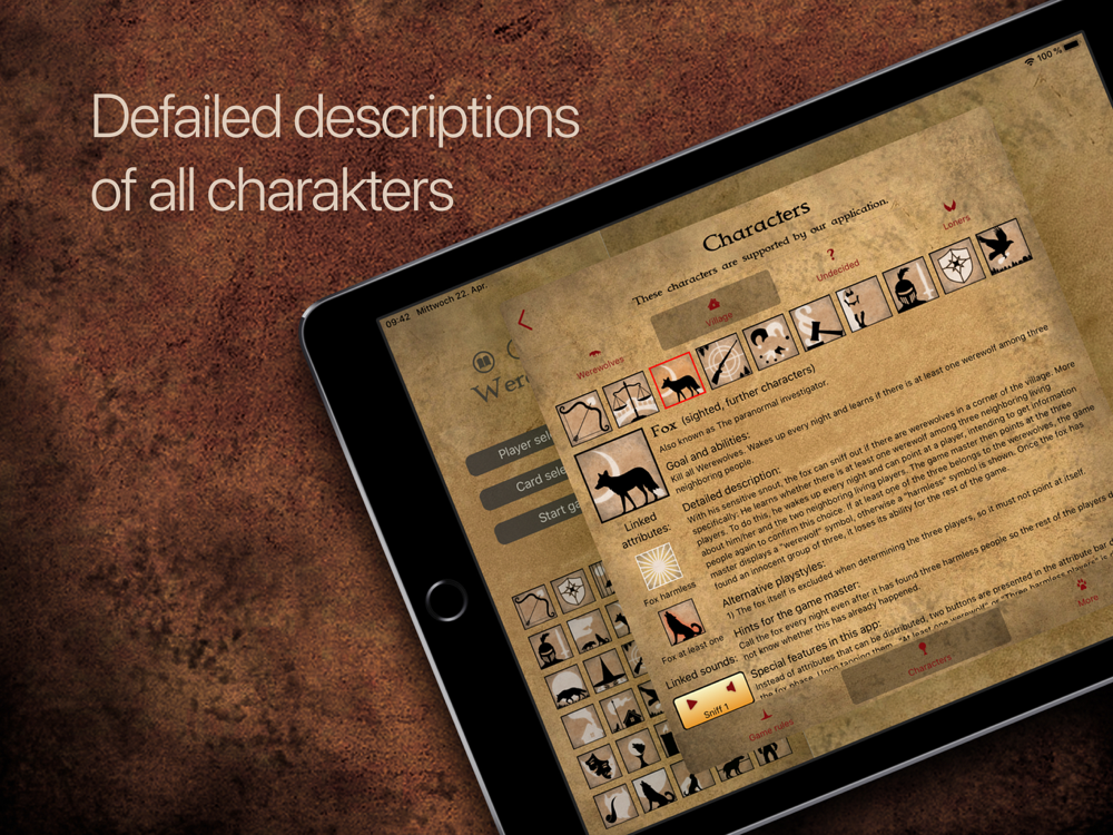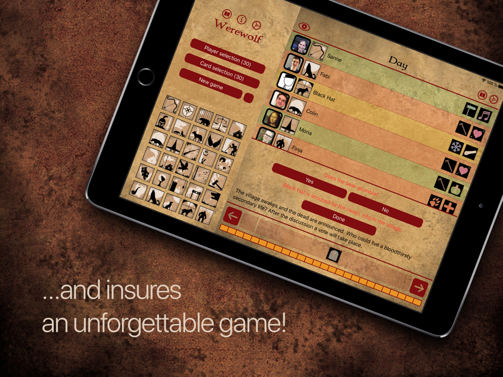 "Werewolf - Narrator" is intended for just that - with a simple tap, characters and attributes can be assigned to the players. Music and sound effects which adapt to the scenes also ensure a unique and new experience playing the game.