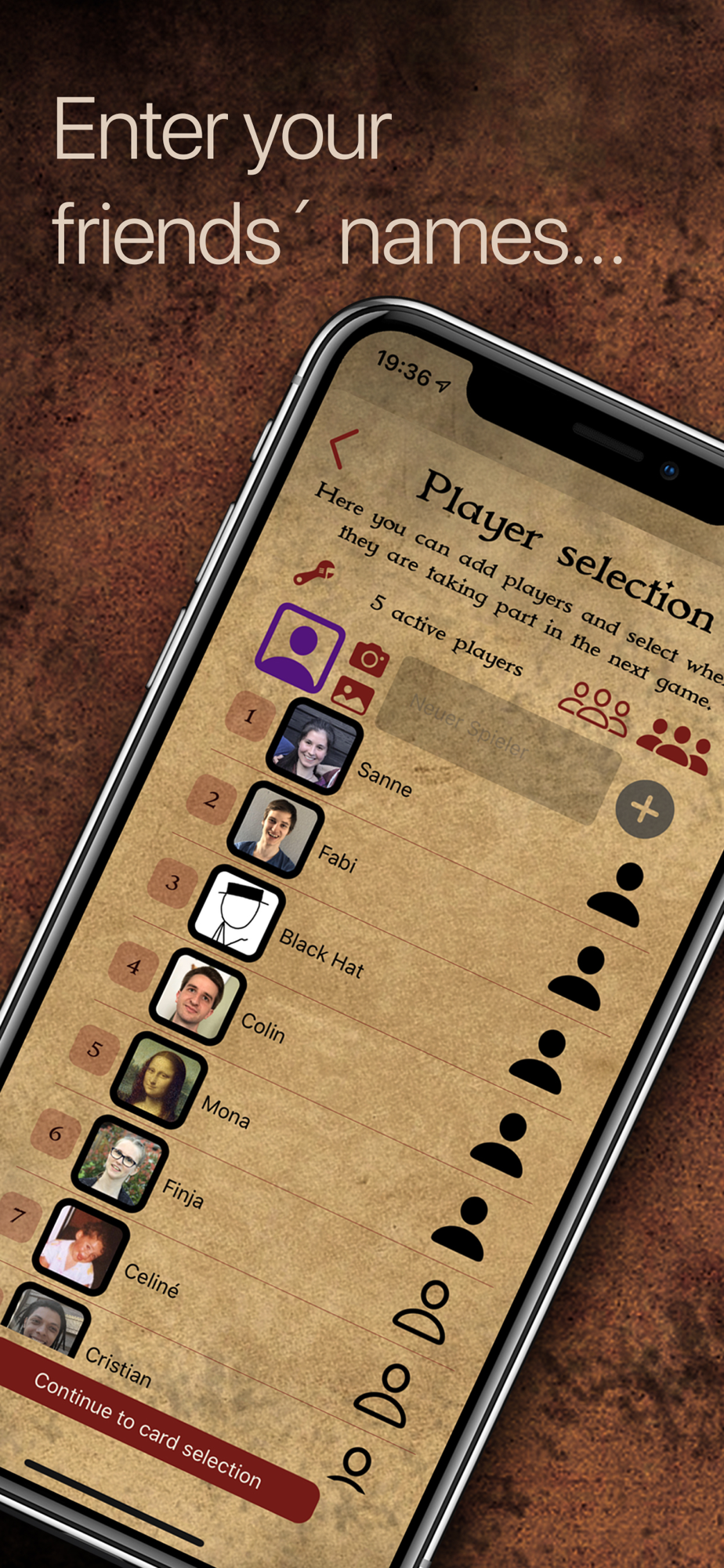Warning: This app is primarily intended to be played with physical cards (or sticky notes) that are dealt. As the narrator, you only get to know the identities of the players during the course of the game, and then you can assign them in the app.