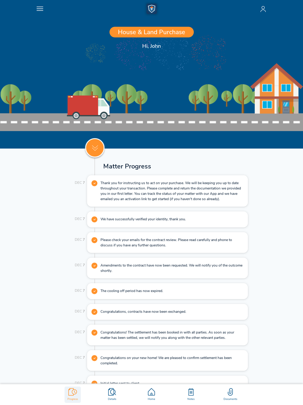 With any legal service, you’ll want visibility over the matter without having to pick up the phone! In a world of mobile devices, we now expect the ability to review progress at a time that is convenient to us. This app has been designed with features that keep you updated by providing live matter information. Whether you simply want to check the quote or if you wish to keep track of progress, this is the app for you. You’ll be able to clearly see each step in the legal matter so you understand the process.