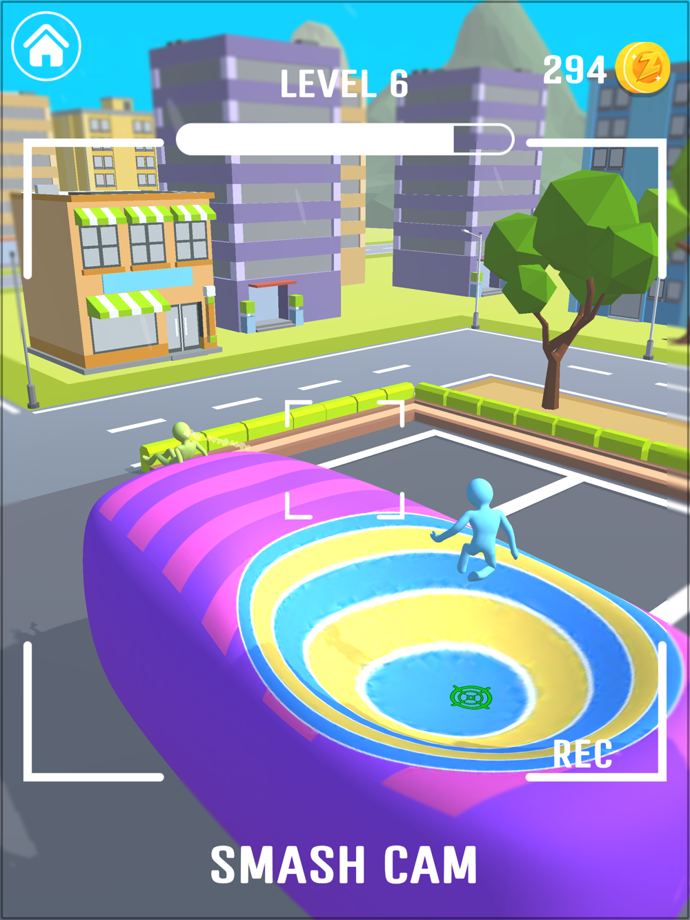 Win levels by throwing him such that he destroys the objects at the end of each level.