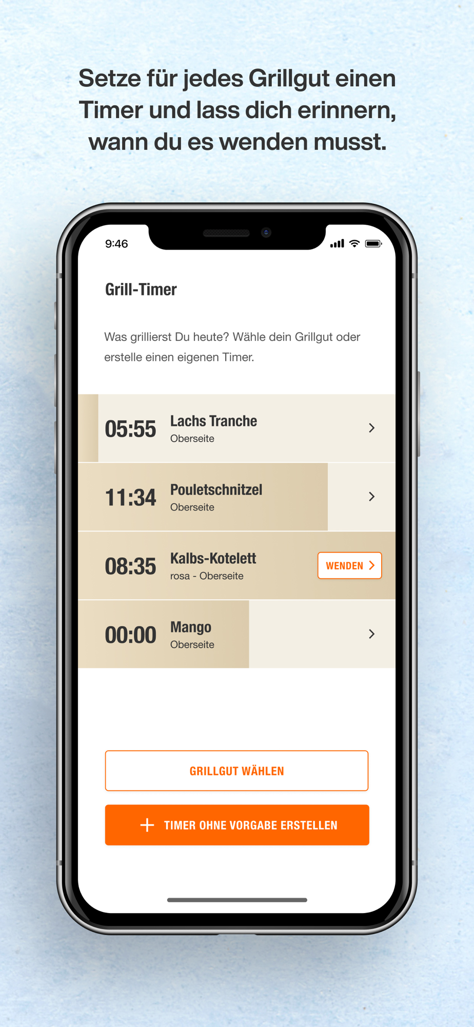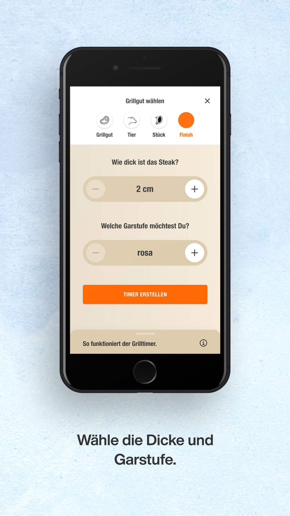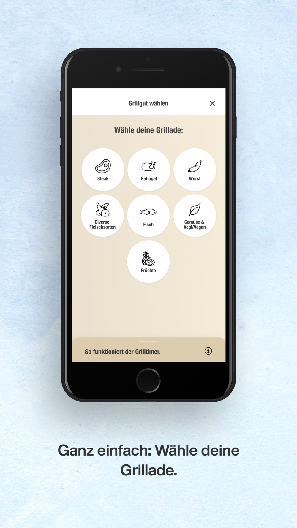 Einfach ein Grillstück auswählen und den Timer starten. Unsere Kulinarikexperten haben für alle vordefinierten Grillstücke die perfekten Garpunkte ausgewählt.