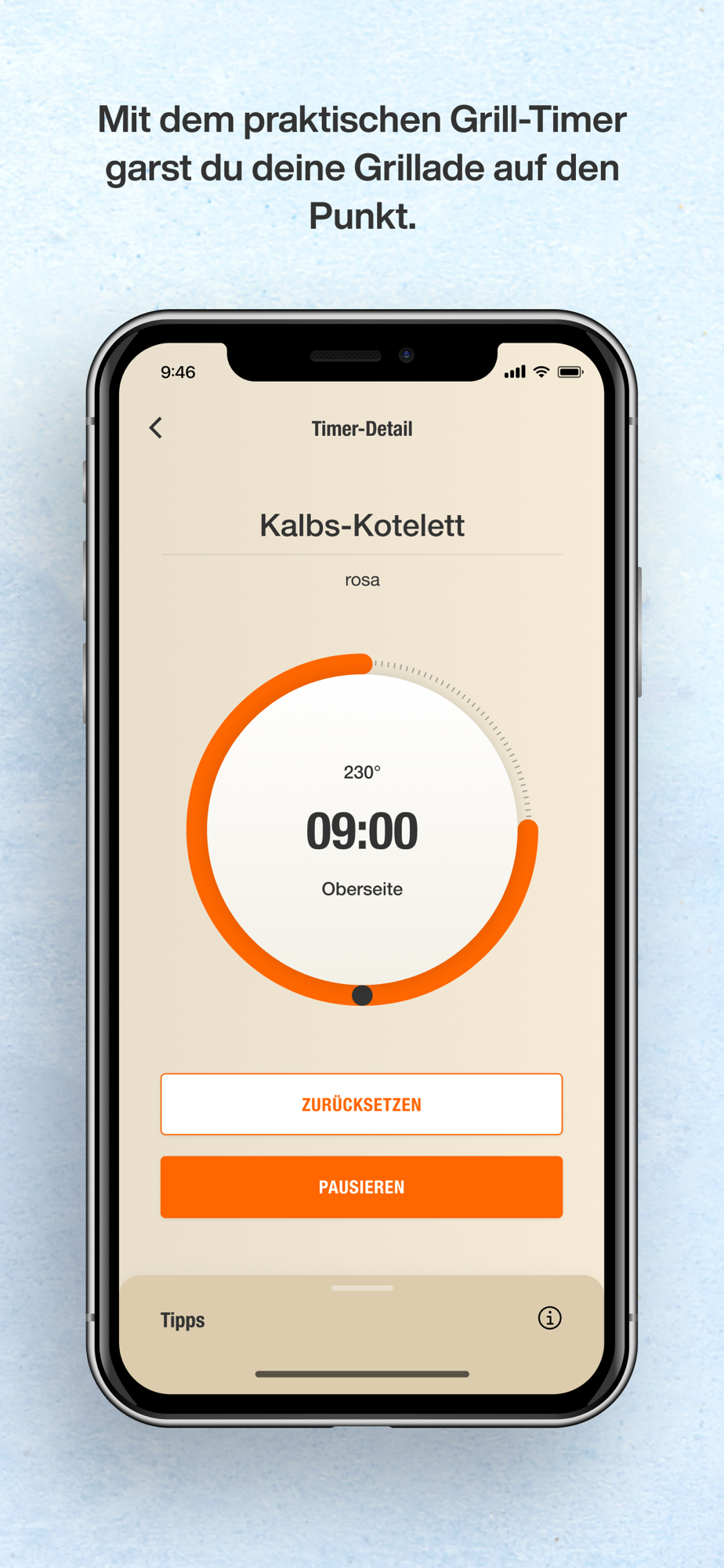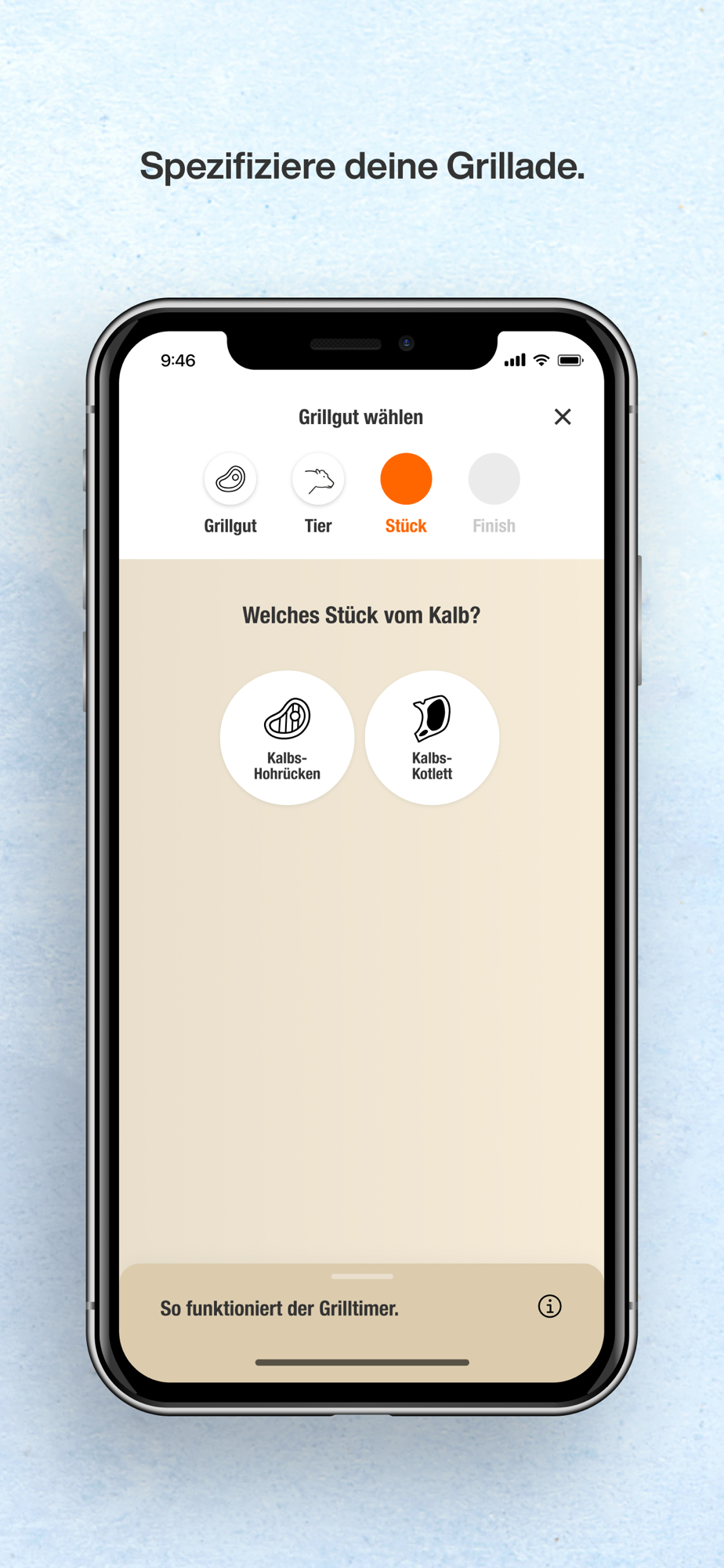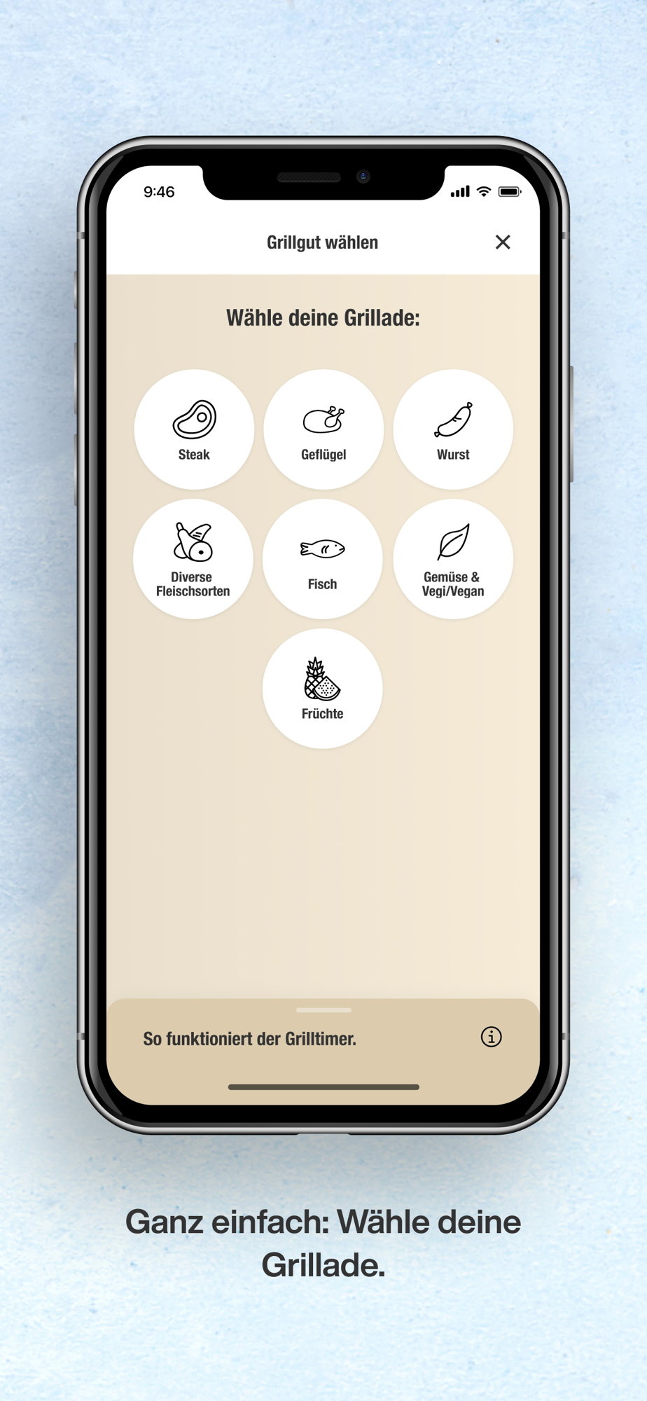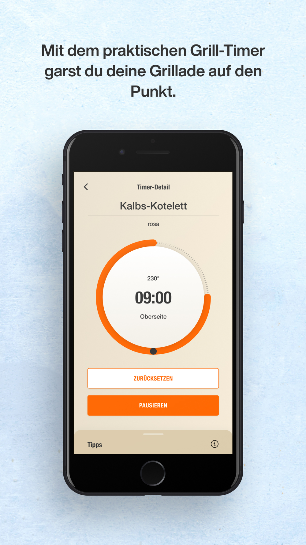 Einfach ein Grillstück auswählen und den Timer starten. Unsere Kulinarikexperten haben für alle vordefinierten Grillstücke die perfekten Garpunkte ausgewählt.