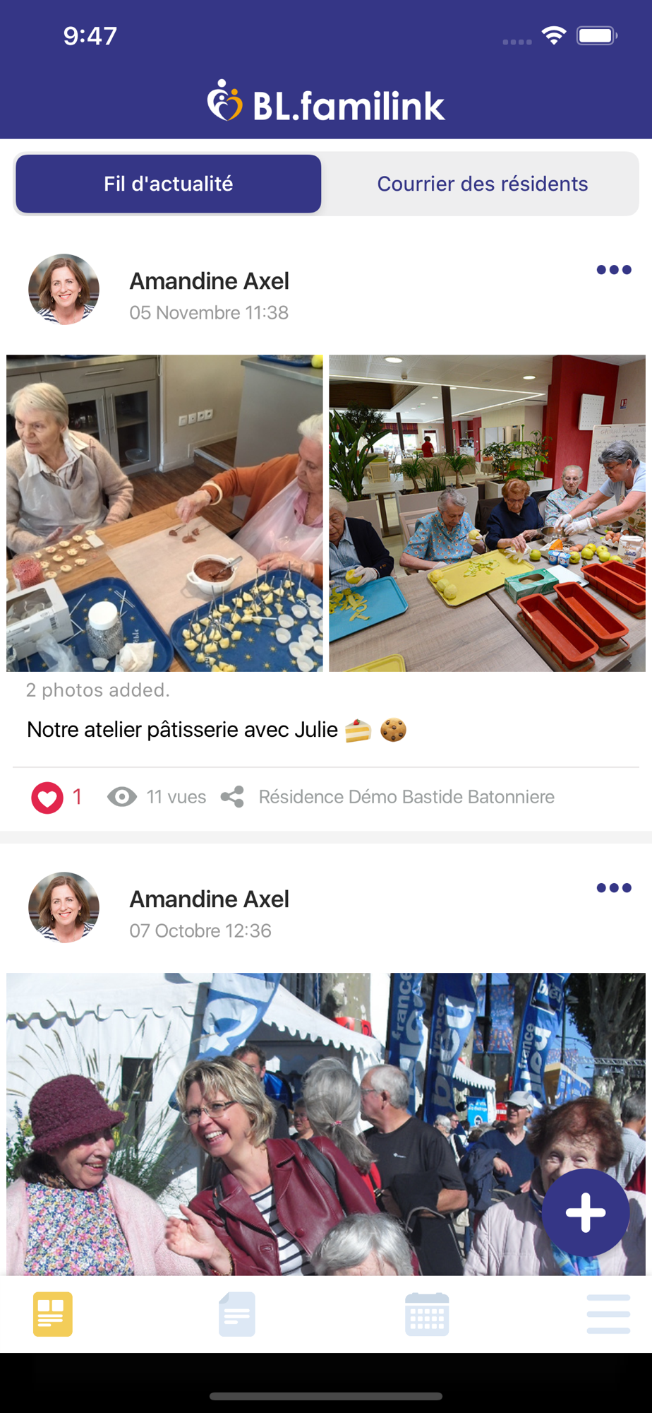 Avec BL.infofamille vous restez informé du quotidien de votre proche au sein de l’établissement BL.infofamille. L’équipe vous partage la vie sociale de la résidence au travers d’un fil d’actualité reprenant les photos et vidéos des activités, les menus de la semaine, les documents et tout ce qui vous permet d’être au plus près de votre proche en résidence.